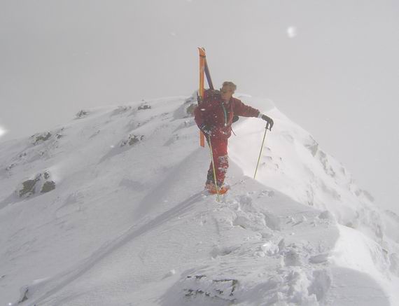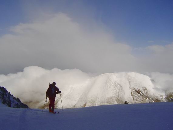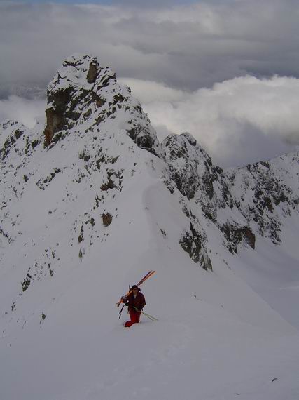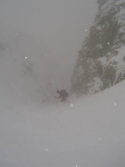 Meteo chaotique à l'image de la semaine écoulée. Rattrappés par le brouillard au pied des rochers, on a finalement été contents de trouver l'accès au sommet. Descente de la combe à l'aveuglette, dommage car la neige y était excellente