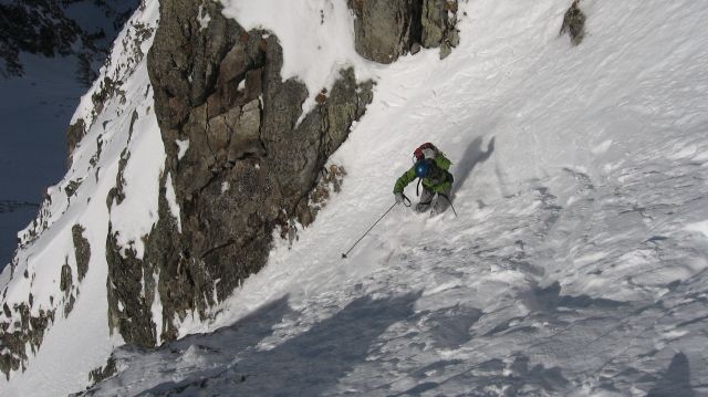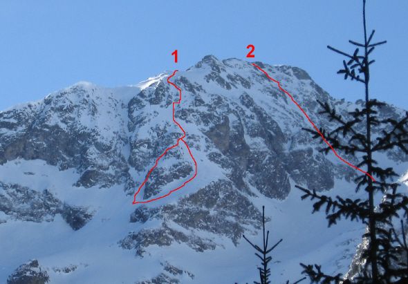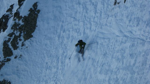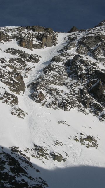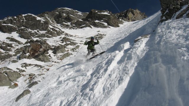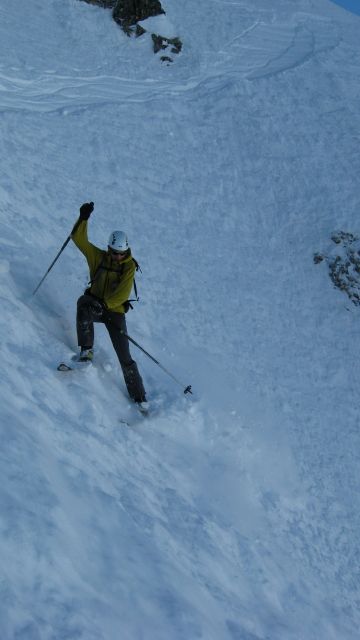 Couloir NO du grun, tracé N°2: 5.1/E3=250m à 45° de moyenne dont 100m à un bon 50°, une étroiture.