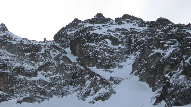 Dans les pentes raides, la neige récente a peu ou pas accroché à l'ancienne couche. Donc bonne stabilité avec une croute de grain fin tendre mais cassante à pied donc gros brassage à la montée à pied dans une neige sans cohésion avec des beaux gobelets tout au fond. Par contre cette croute restait portante à la descente avec du très bon ski. Une étroiture en glace dans le couloir NO, déchaussage obligatoire.