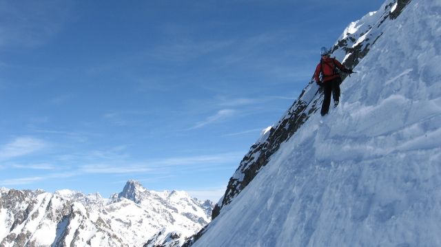 Face N de l'antécime N, tracé N°1: 5.2-5.3/E4= 250m à 50°, pass plus raides.