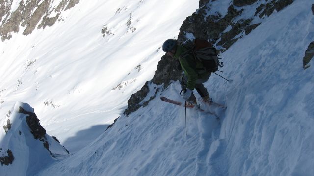 Après cette jolie descente , direction la brèche des rochers du cros et là nous sommes immédiatement attirés par le beau couloir NO au soleil mais défendu par une étroiture. Descente de ce dernier avec les belles lumières de fin d'après midi (et oui 2300m ça nous prend du temps à nous ;-) !)