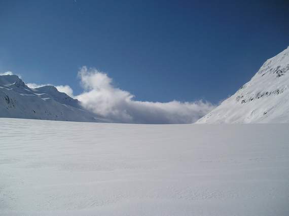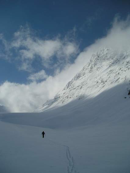 L'enneigement est bien meilleur dans cette vallée puisqu'on a pu chausser à la station à 1900 m. De plus il est tombé des quantités importantes de neige les jours précédents. Les pentes sont chargées et on a préféré un itinéraire présentant des risques limités.