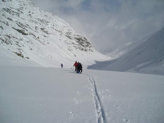 commencer par monter en traversée vers le sud dans les pentes au dessus du refuge sur 80 m environ puis redescendre toujours en traversée dans la vallée du Langataler. On la remonte par sa rive gauche jusqu'au col sous le Hohe Wilde Südl. D+ = 1100/2.1 (pour le col)
