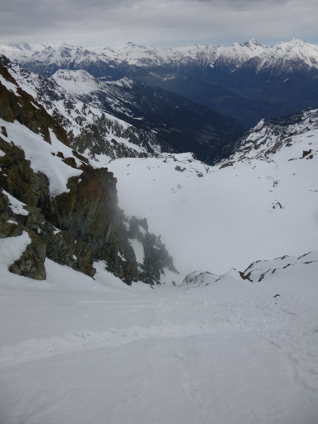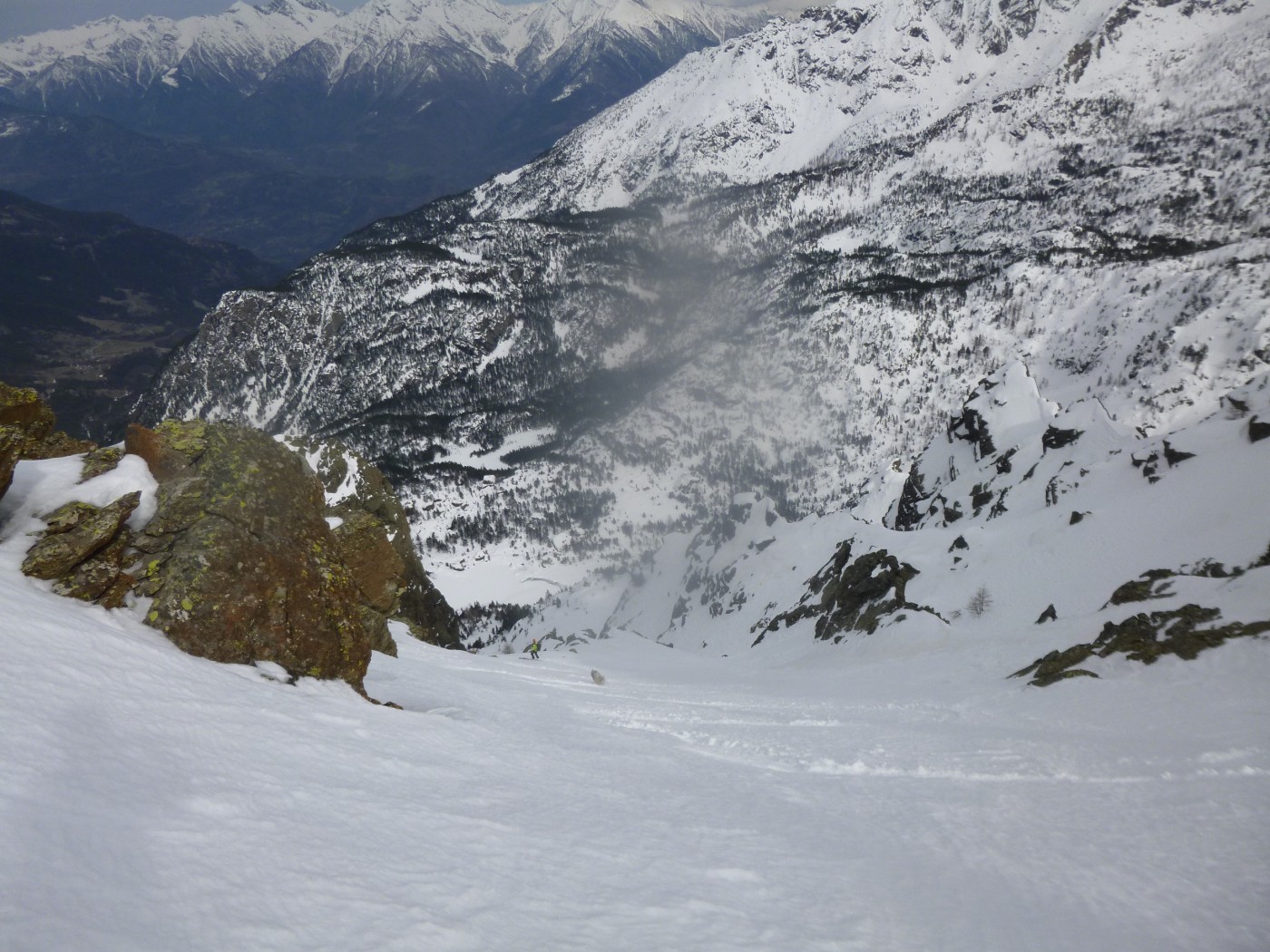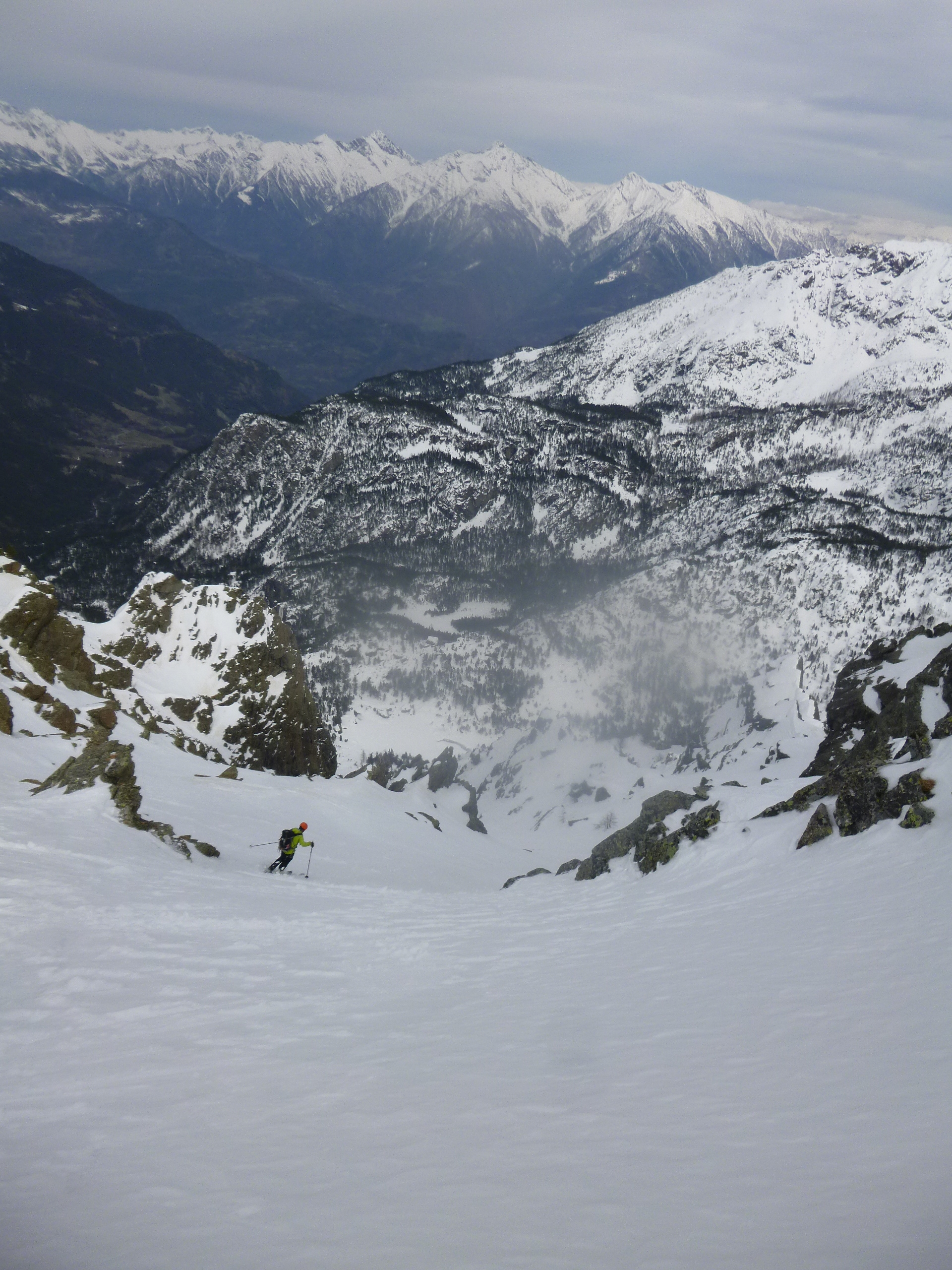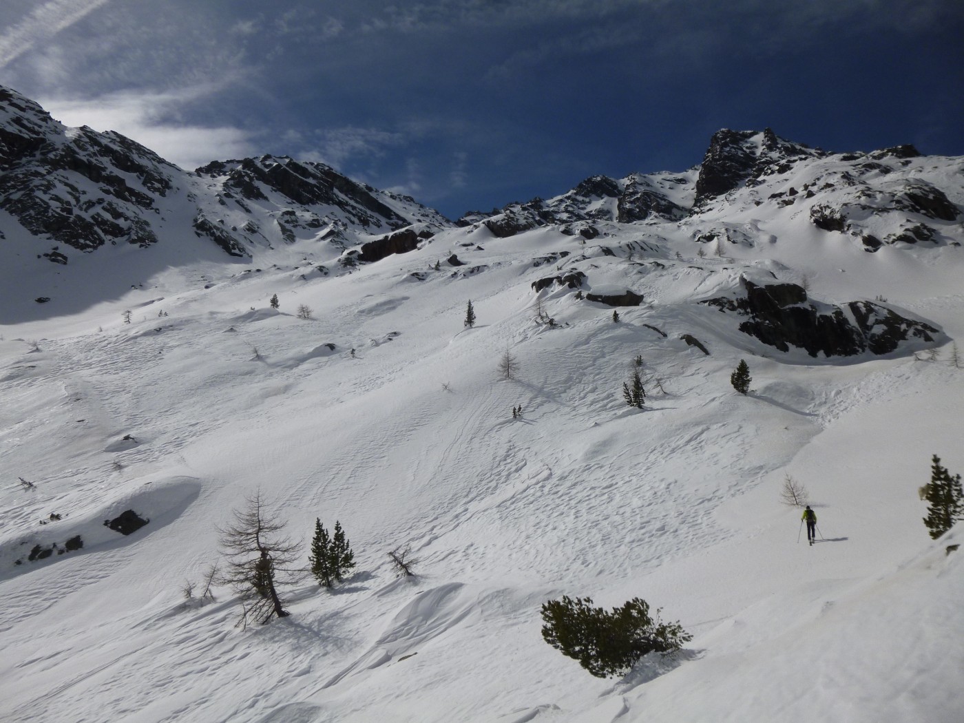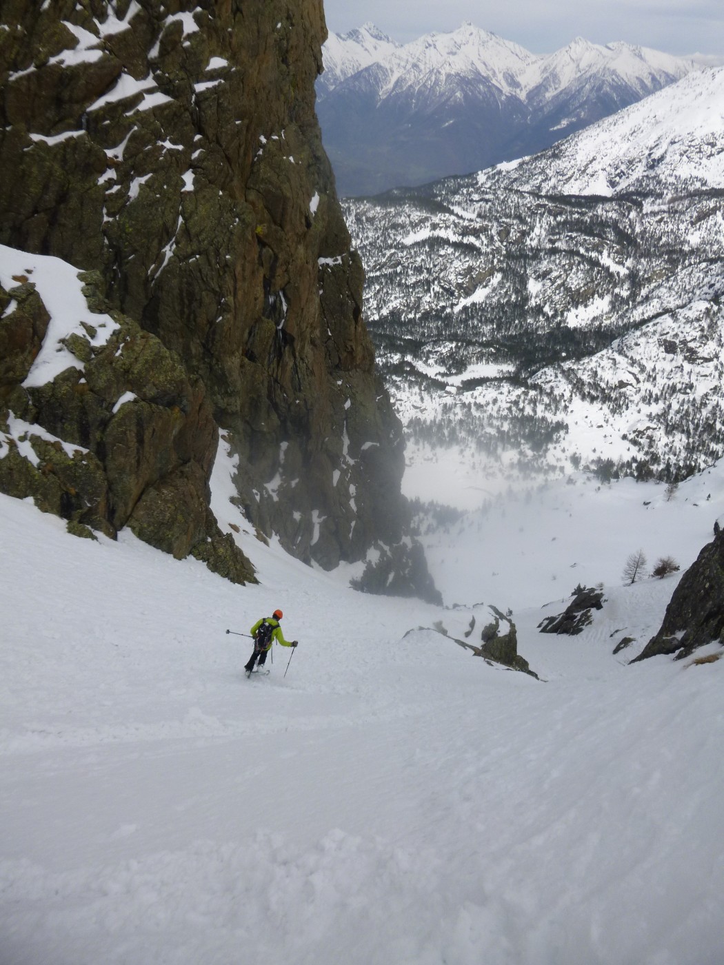 Jolie boucle qui permet d'enchainer trois couloirs NE. Le premier (le couloir de l'Iverta) n'était pas assez fourni sur ses 50 premiers m pour être skié. En-dessous c'était bon avec 50m à 45° puis environ 40° sur les 200m suivants. Le deuxième (le couloir supérieur de l'Envers du lac Gelé) est raide dans le haut (entrée de couloir à plus de 50°) puis 40° sur 350m. Le troisième (le couloir inférieur de l'Envers du lac Gelé) est plus long mais moins raide (35°/500m). Merci à Dani, contributeur d'itinéraires originaux sur Gulliver, qui a parcouru les deux couloirs de l'Envers du lac Gelé [il y a une semaine -> http://www.gulliver.it/itinerario-gite/14716/#!]. Les trois couloirs sont biens remplis (hormis l'entrée du premier). Bon ski aussi sur le sentier entre le lac de la Servaz et Magazzino grâce à l'enneigement abondant.