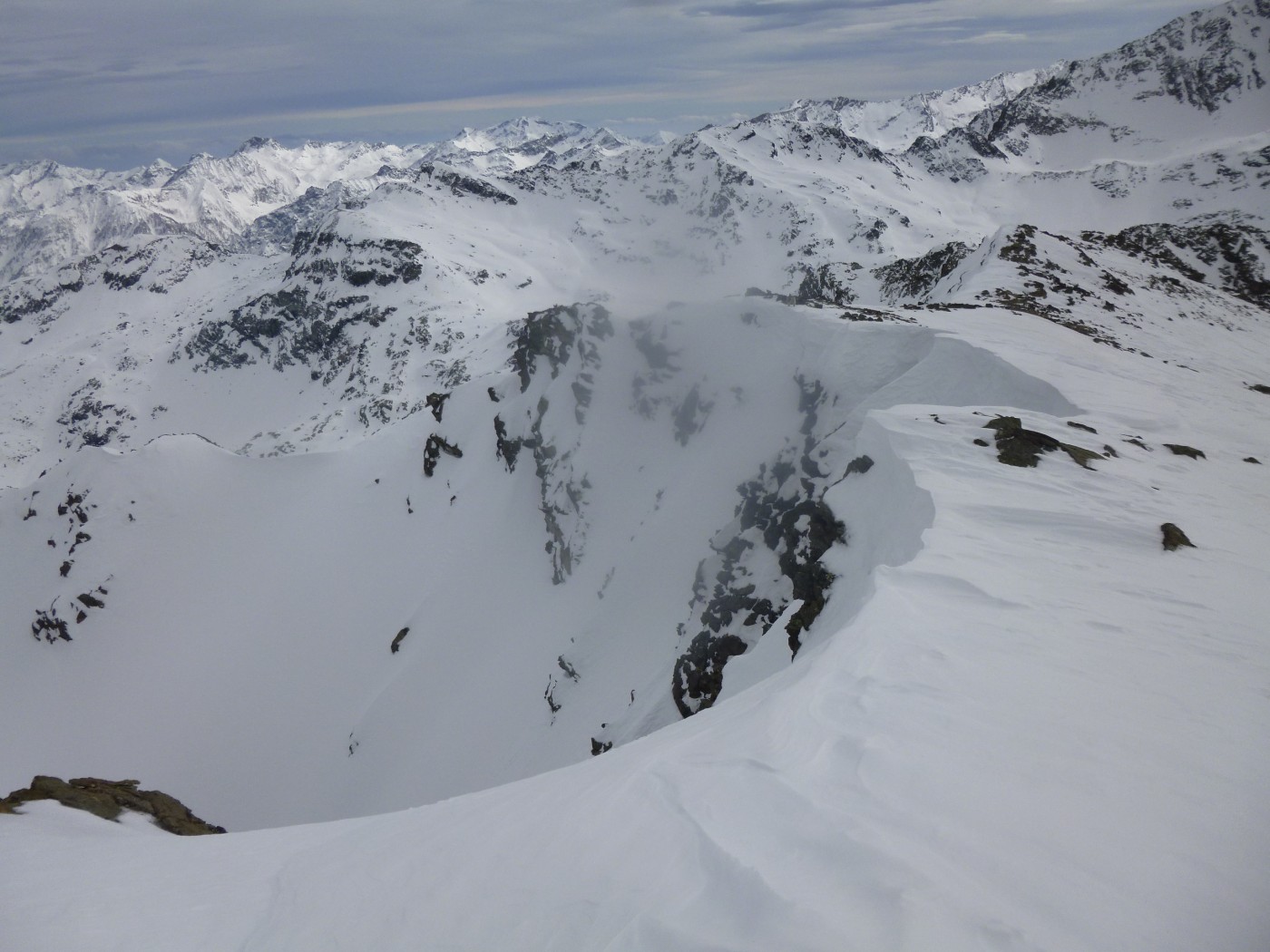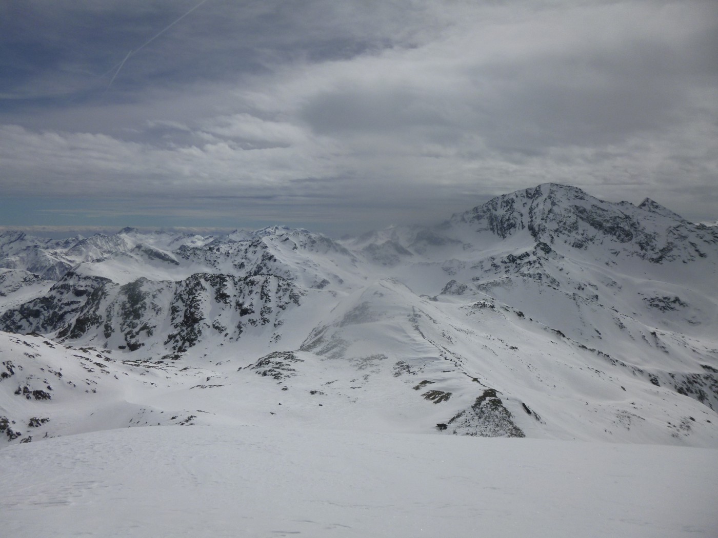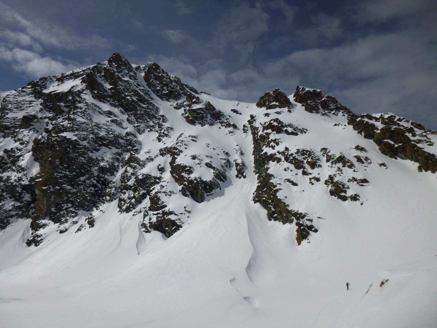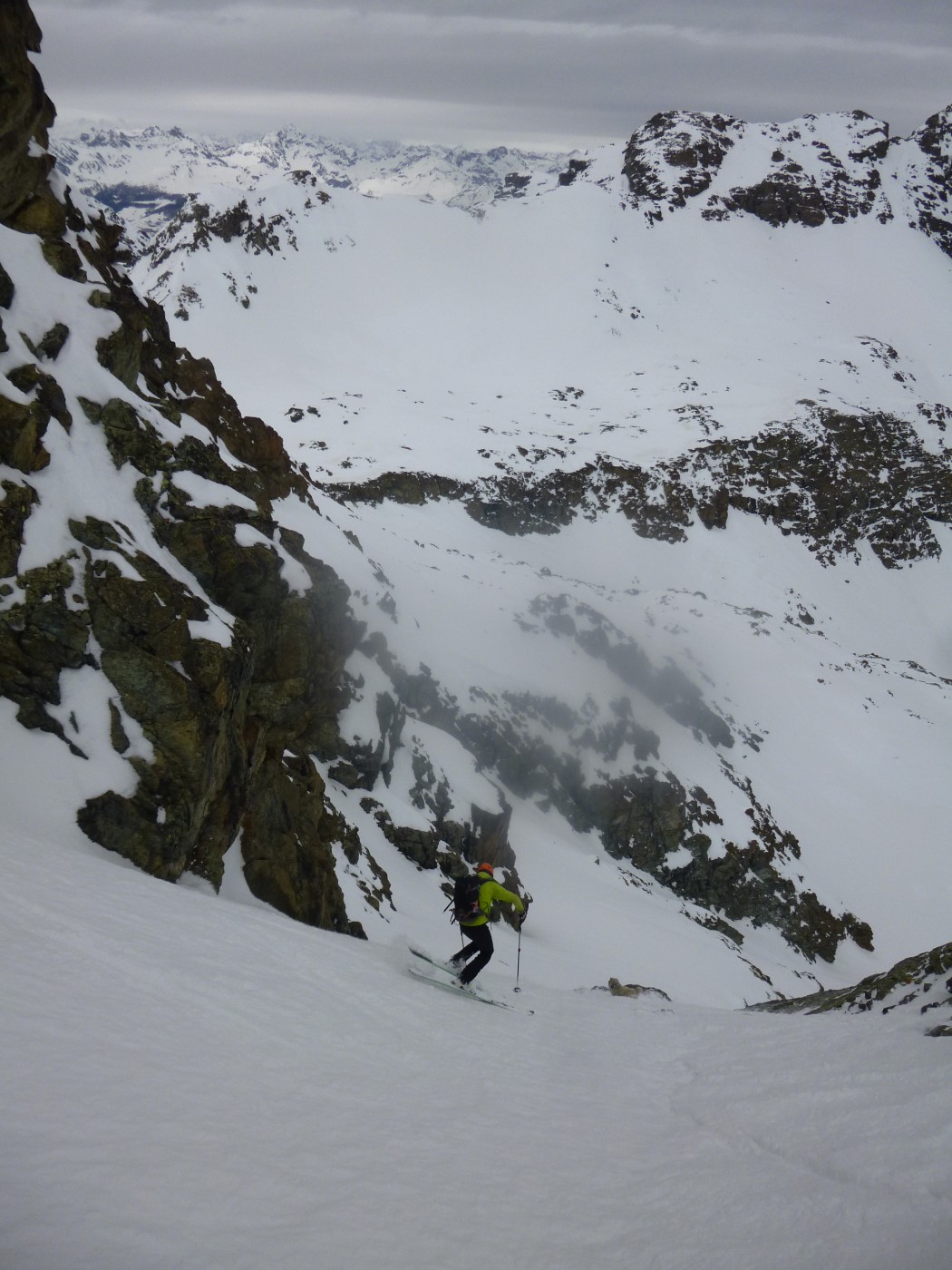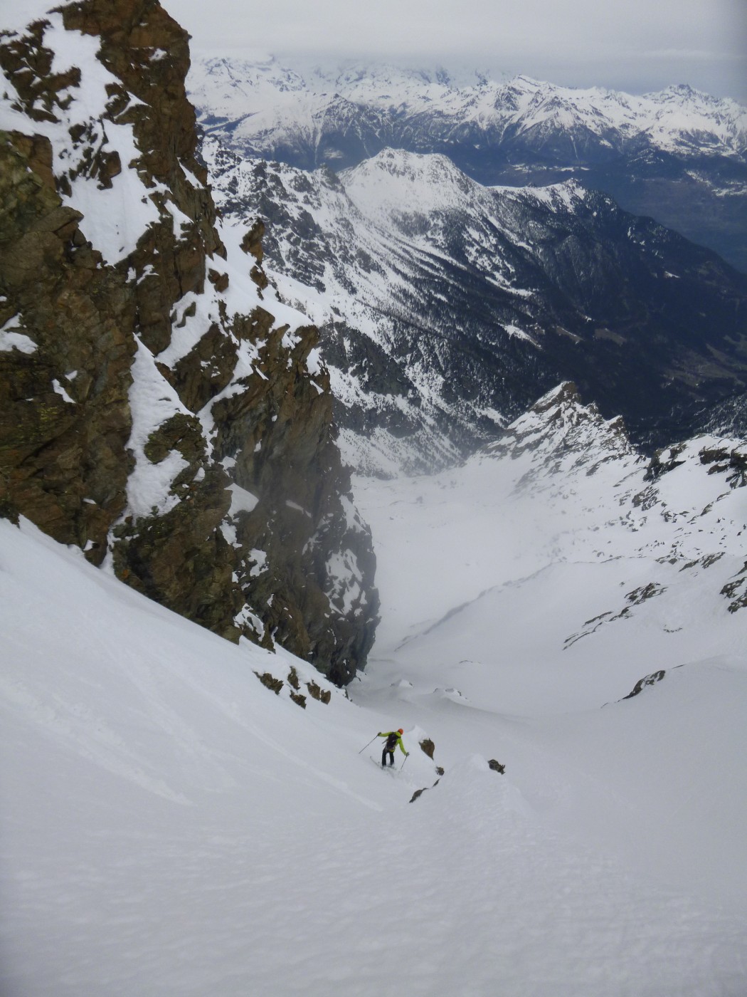 Jolie boucle qui permet d'enchainer trois couloirs NE. Le premier (le couloir de l'Iverta) n'était pas assez fourni sur ses 50 premiers m pour être skié. En-dessous c'était bon avec 50m à 45° puis environ 40° sur les 200m suivants. Le deuxième (le couloir supérieur de l'Envers du lac Gelé) est raide dans le haut (entrée de couloir à plus de 50°) puis 40° sur 350m. Le troisième (le couloir inférieur de l'Envers du lac Gelé) est plus long mais moins raide (35°/500m). Merci à Dani, contributeur d'itinéraires originaux sur Gulliver, qui a parcouru les deux couloirs de l'Envers du lac Gelé [il y a une semaine -> http://www.gulliver.it/itinerario-gite/14716/#!]. Les trois couloirs sont biens remplis (hormis l'entrée du premier). Bon ski aussi sur le sentier entre le lac de la Servaz et Magazzino grâce à l'enneigement abondant.