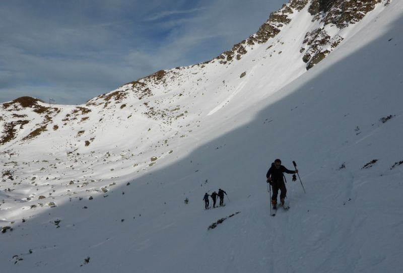 Départ du garage à dameuse à l'extrémité sud de Prapoutel, piste de ski, combe de Bédina, sommet du Jas des lièvres par couloir N, face ouest, retour vers la station en traversant à droite à niveau (1750 env).