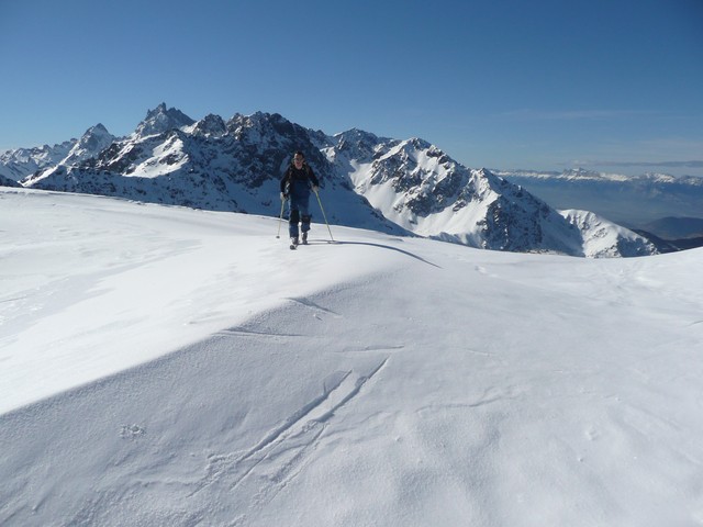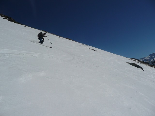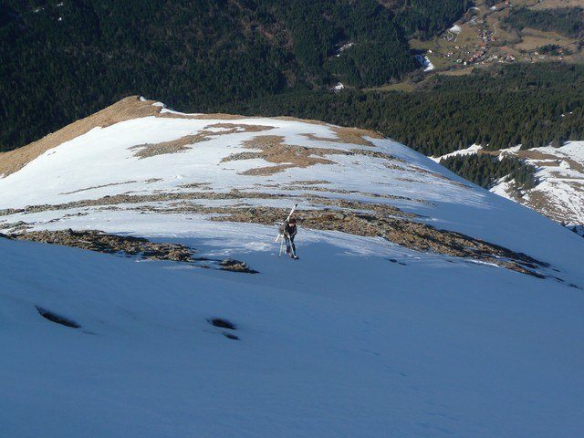 Il aurait fallu attendre trop longtemps au sommet pour profiter d'une neige correcte en face Ouest. Donc descente par le Sud, avec un déchaussage obligatoire entre 1780 et 1700 m pour rejoindre "la piste" de la Jasse.L'enneigement est bien faible pour un début mars.