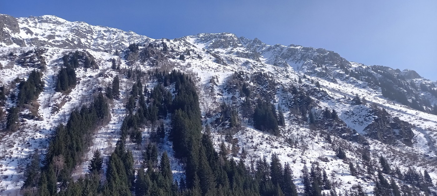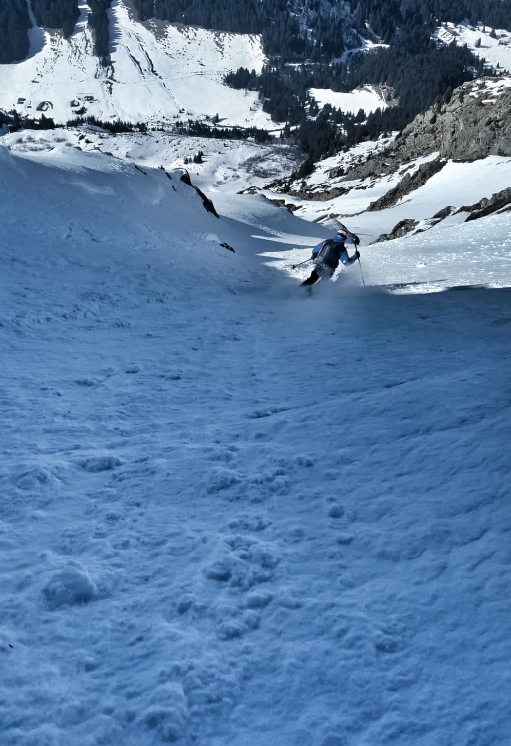 Voie Romaine en glace sur le bas, puis neige dure, trafolée et travaillée par le vent. Dans le couloir : le haut en neige froide (alternance de croûte et de vieille poudre), puis neige dure avec bon grippe et neige transformée.