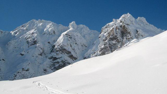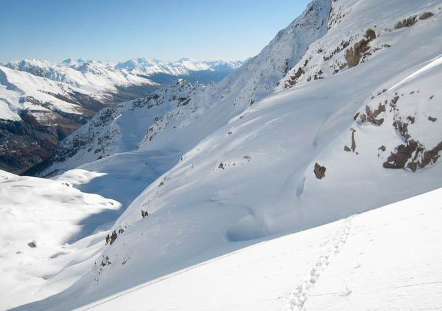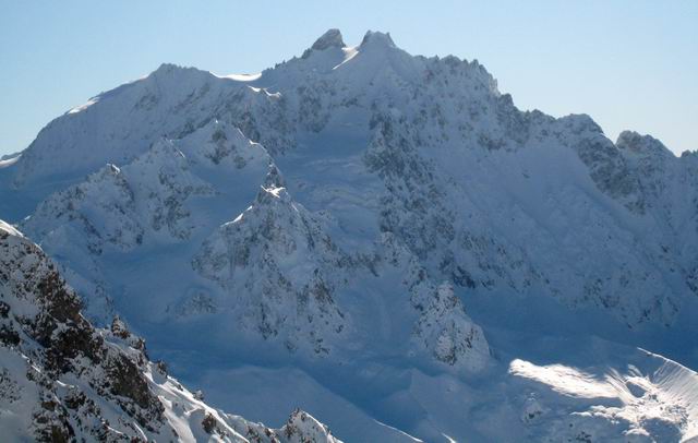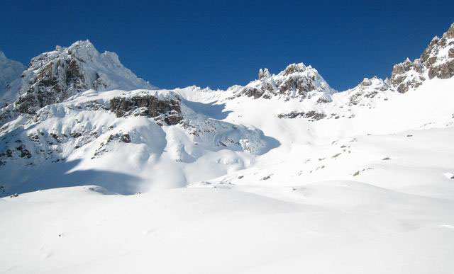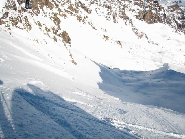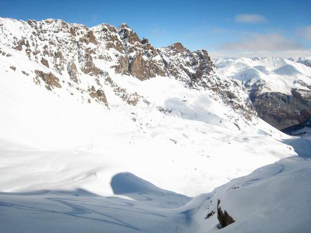 Les grosses chutes du we dernier ont du tomber très humides jusqu'à au moins 2800 car à cette alitude même les versant est, à l'ombre à cette époque, ont une sous-couche bien compacte et dure. En surface la neige de lundi est restée froide et seule cette couche est légèrement travaillée par le vent sous les crêtes mais sans plus. Les traces de ruptures par plaques sont d'ailleurs peu épaisses, en revanche de grosses avalanches se sont déclenchées un peu partout par surcharge, pas étonnant quend on voit les quantités tombées