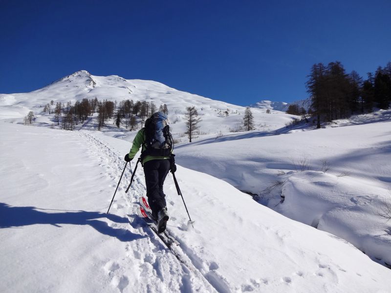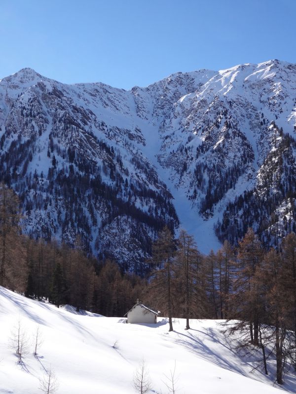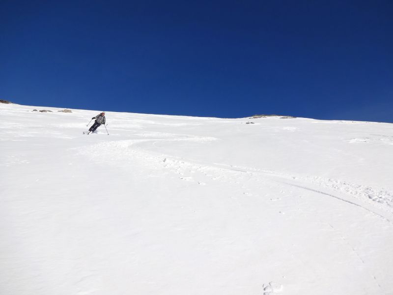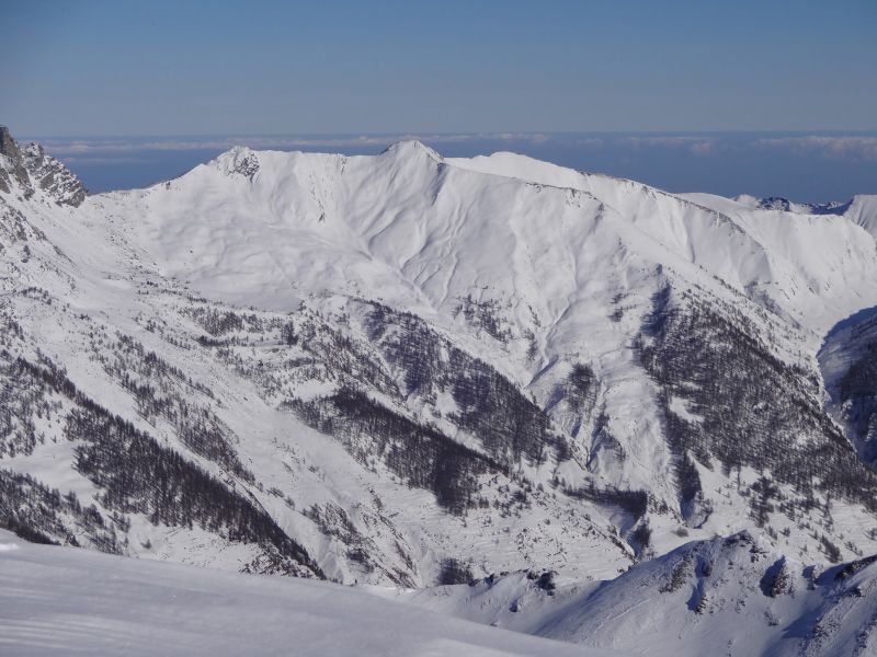 Versant froid (-16° au départ à 10h30). L'enneigement du vallon est très bon. Les épaisseurs ne sont pas énormes mais les neiges anciennes transformées presque partout (béton, plaque dure, transfo... en fonction de l'exposition et du travail du vent dans les parties hautes) sont couvertes d'une couche de 20/40cm de belle poudre jusqu'à la limite de la forêt et dans les pentes au-dessus, d'une pellicule de quelques centimètres (style peau de panthère avec des zones décapées par le vent). Les petites combes sont un peu garnies sans plaques. Même dans les couloirs de l'ubac de la Gardiole, pas de marques importantes d'instabilité. Bonne skiabilité et pourtant c'est un désert ?