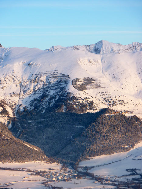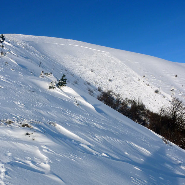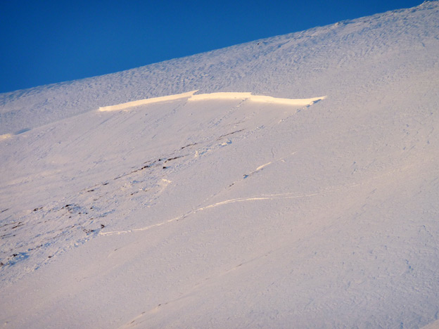 peu de neige en partie basse mais grosses accumulations sous le sommet. Une belle plaque d'au moins 80 cm et large de 0,1 km s'est détachée au-dessus de l'entonnoir. Surpris par la petite croute de surface en sud-est avec ce froid même au soleil.