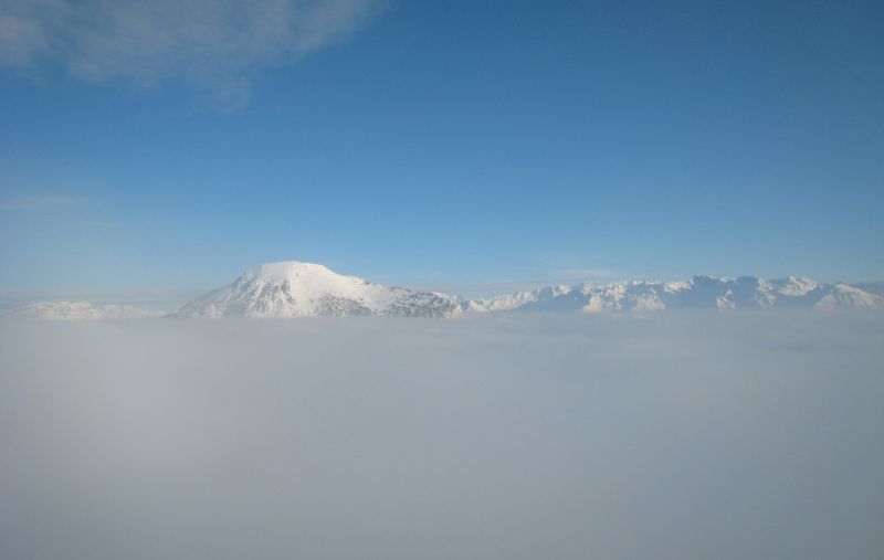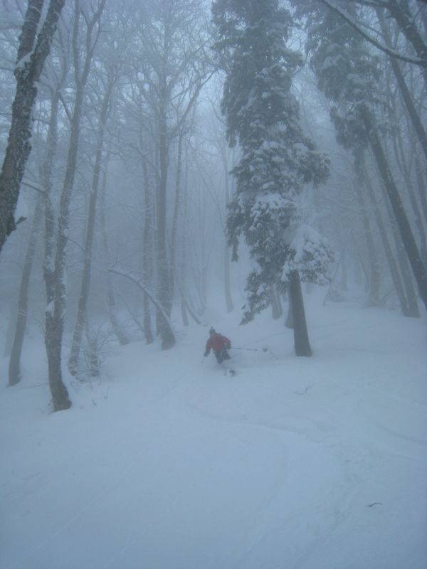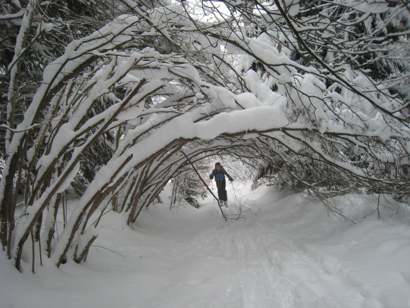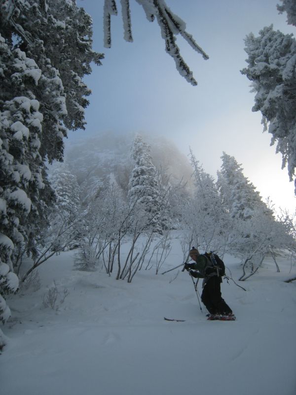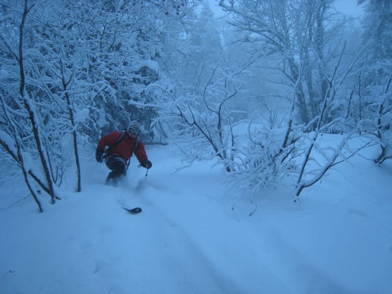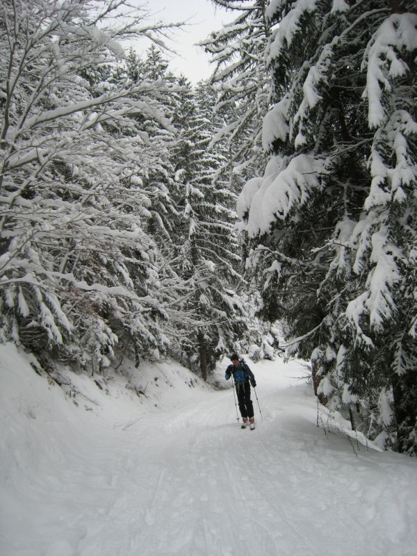 Très jolie sortie dans une ambiance cotonneuse et gratifiée d'un immense ciel bleu une cinquantaine de mètres sous la brèche. Le seul hic c'est la densité des vernes rendant surtout dans le haut l'itinéraire peu skiant. C'est mieux plus bas. Route forestière pour le retour ok.