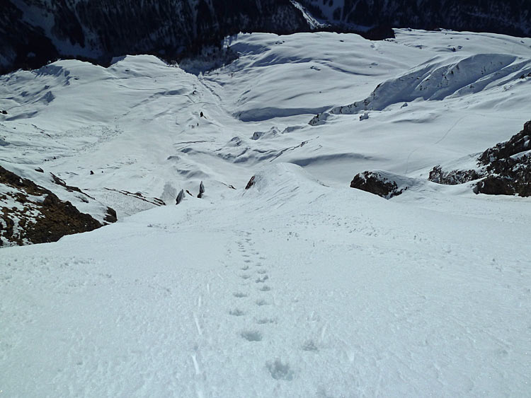 Les 5-10 cm de neige surchauffée ont tendance à glisser un peu en cas de virage un peu appuyé, pas du goût de tout le monde (sauf les anciens snowboardeurs...)