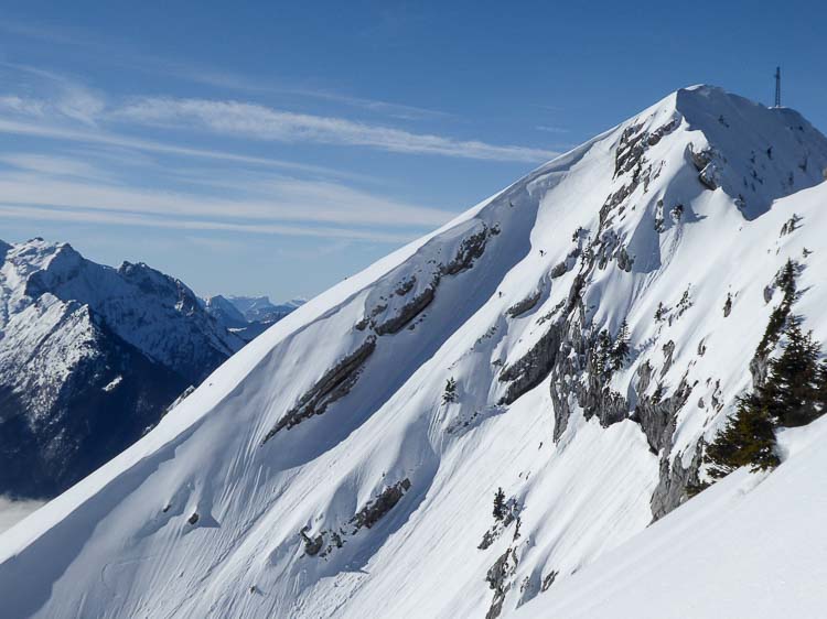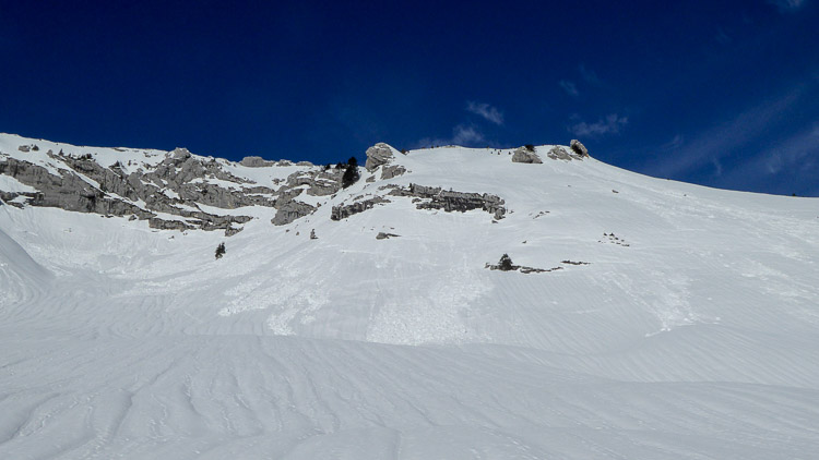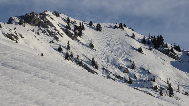 Du relief (cannelures de pluie) sous 1600 et chemin encore dur à la descente, mais très bonne neige au-dessus (descente vers 10h00 pour le couloir)