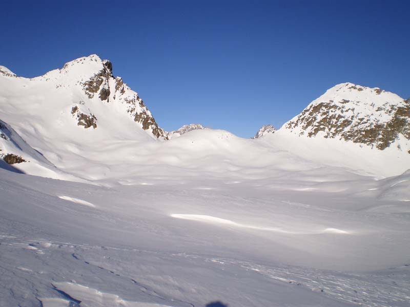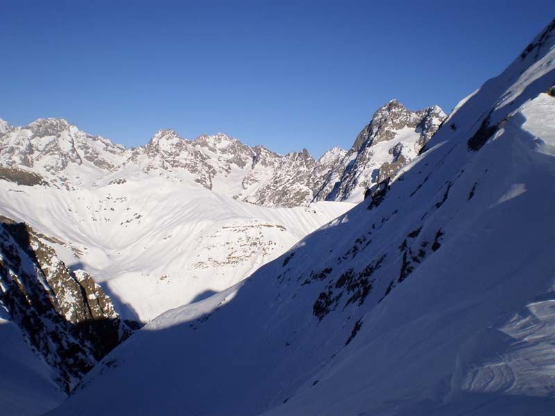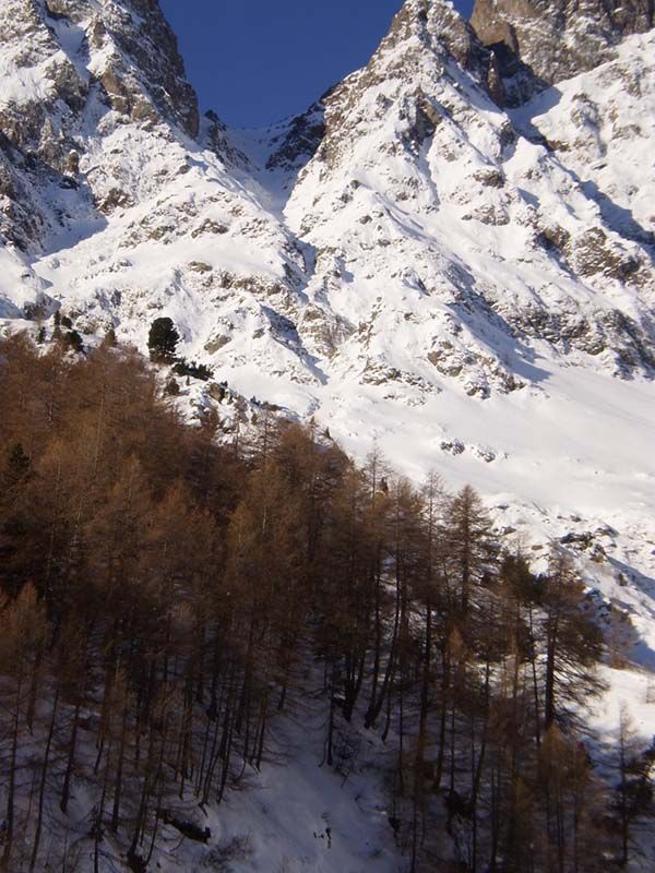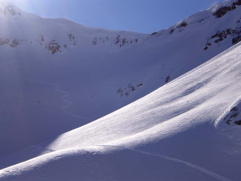 Conditions un peu délicates en montant au col des Lauzières en raison des nombreuses plaques sur les rives du ravin à droite de la côte des Murets. Ce sont plutôt des plaques de surface plus ou moins dures, dont certaines ont été désagrégées par le froid. Par sécurité, j'ai préféré remonter le ravin lui-même, en partie rempli et durci par des coulées, mais la progression fut lente. J'ai dû déchausser dans un étroit couloir plus raide sur près de 100 m. J'ai alors pu constater la présence de 3 sous-couches de regel, dont la plus profonde est assez solide, mais tout le reste, c'est de la face plane et sans doute du gobelet au sol... Pourtant, pas d'affaissement ni de " voum ". Des pentes tentantes à droite sont en faces planes sur dond dur, dangereux au-dessus des barres. La combe du Veyre est affreuse à skier, mais a priori sans grand danger, les plaque