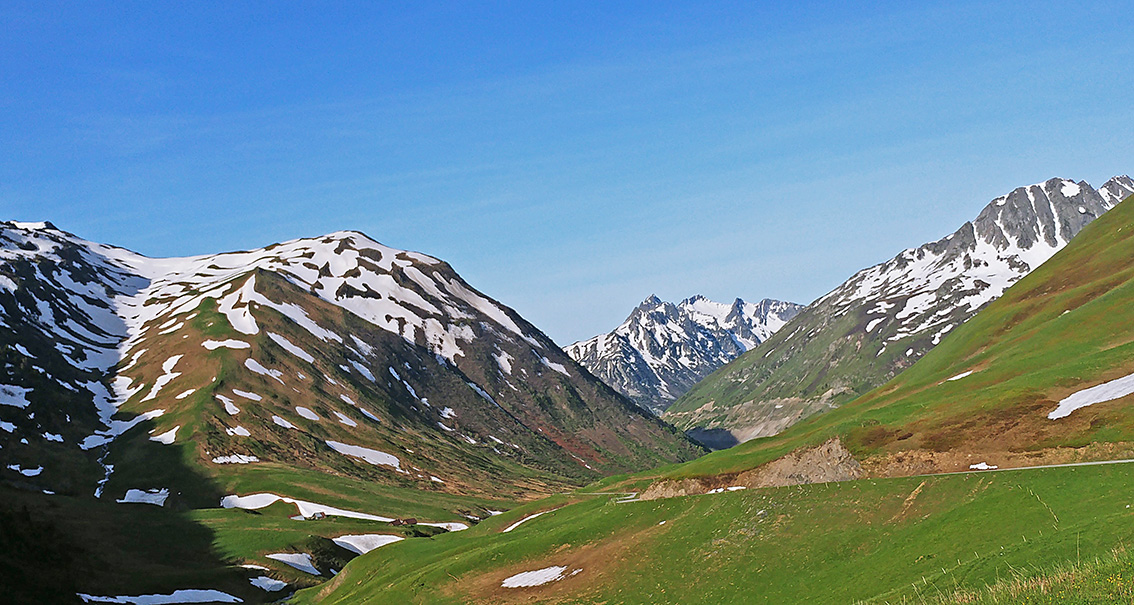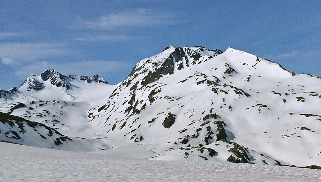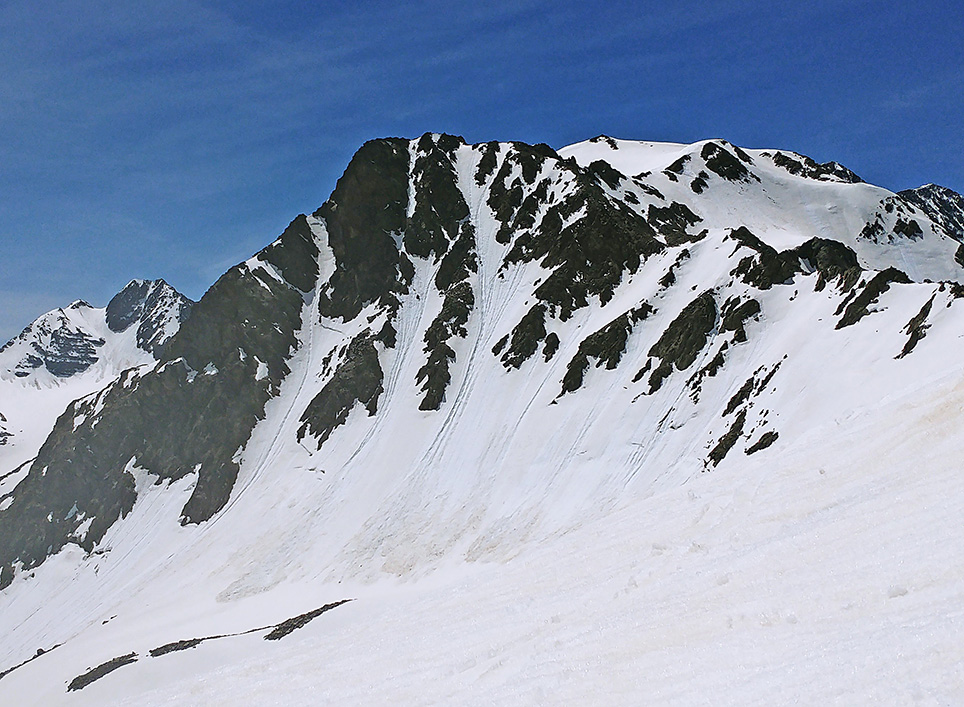 Névé assez bien tassé et glissant.Les zones d'enfoncement deviennent rares. Reliefs de 0 à 30 cm. Les pentes raides, surtout nord sont très abimées (boules, goulottes).