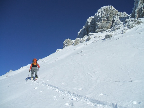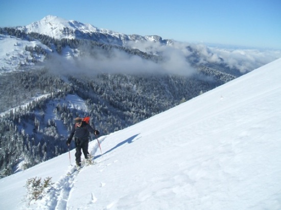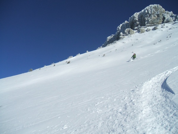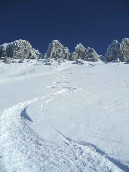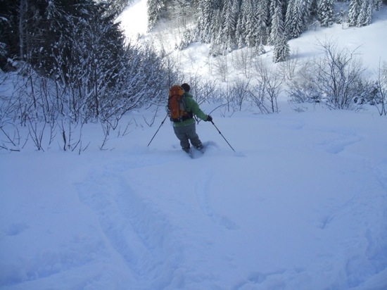 Le chemin de montée est très bon, une couche dure permet un ski sans retenue. Excellente neige en forêt, d'ailleurs on ne touche pas non plus. Plus on monte plus il y en a sauf, dans la dernière pente où les combes sont remplies et les bosses moins chargées. La pente m'a paru assez saine, neige très homogène hormis dans les zones très exposées au vent: neige durcie et sûrement plaquée.On restera dans les zones jugées plus sûres.