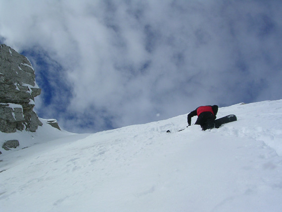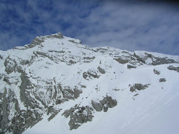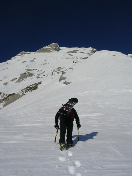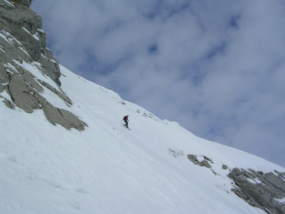 Réveil matinal pour s'offrir cette belle face est de 300m. On s'est arrêté 10-20m sous le sommet pour cause de conditions jugées limites pour la sortie : 20-50 cm de tassée bien réchauffée (par rapport au reste de la face) posée sur les dalles?