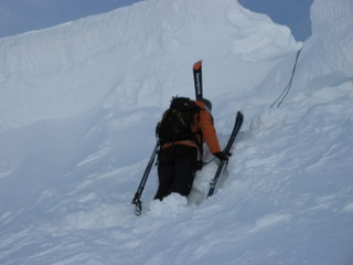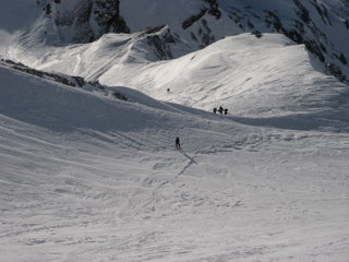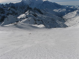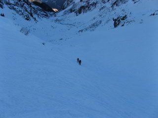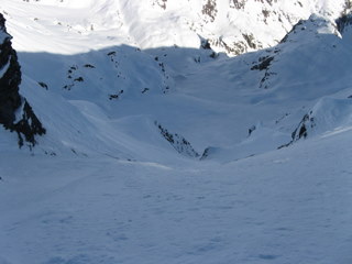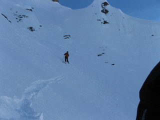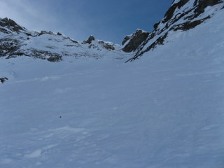 merci à jean baptiste mang pour ses infos et sa photo qui nous a permi de prendre le meilleur tracé et dav pour son assurage au départ de la corniche. c'est très beau et sauvage, toutefois ça reste sérieux, plaques possibles, cailloux nombreux. départ à 50° puis 40-45° sur 400-500 m. les photos à venir