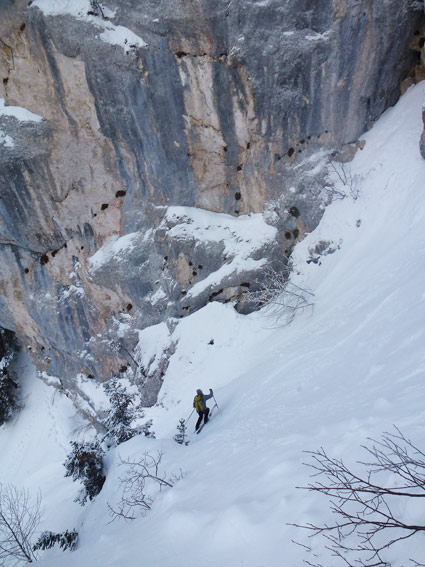 Normalement ce genre de couenne chartroussine se fait le matin, au soleil en grosse poudre et si possible en boucle : on a fait tout le contraire [voir pisthors -> http://pistehors.com/news/forums/viewthread/66/]. Sur le haut quelques étroitures "mlf approuved" sur neige glacée en dérapage et piolet ski. Un peu plus bas, stephane installe sur un arbre un petit rappel de 10 m (dont lui aurait pu se passer en piolet dry-ski) mais qui m'a bien fait plaisir. Le stb est un parfait moniteur pour le vieux qui était un peu au taquet dans le glacé à 45°, particulièrement gênant avec les reliefs d'anciennes coulées. Très bonne descente forestière ensuite dans l'axe de la combe jusqu'à 1100 m.