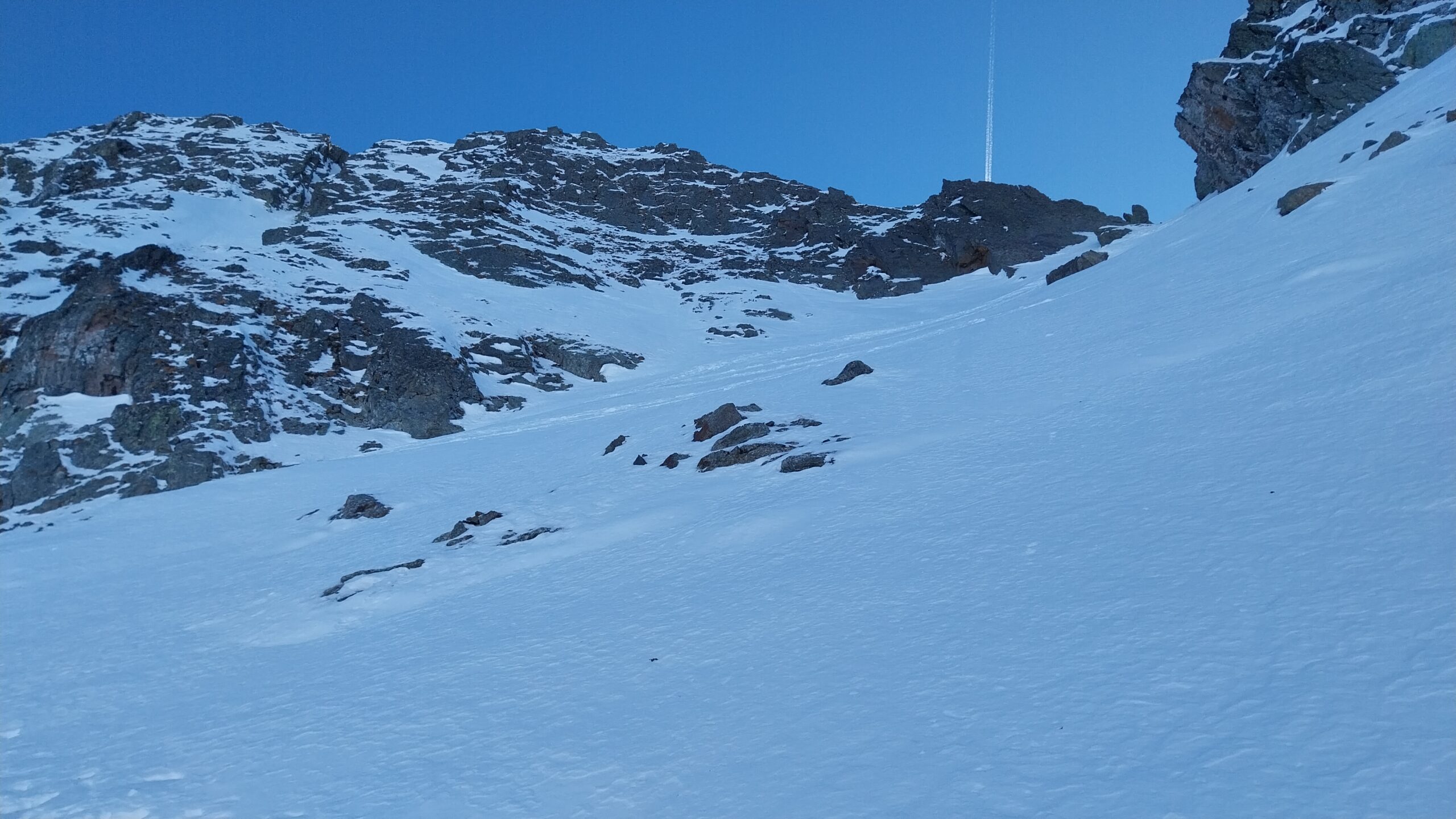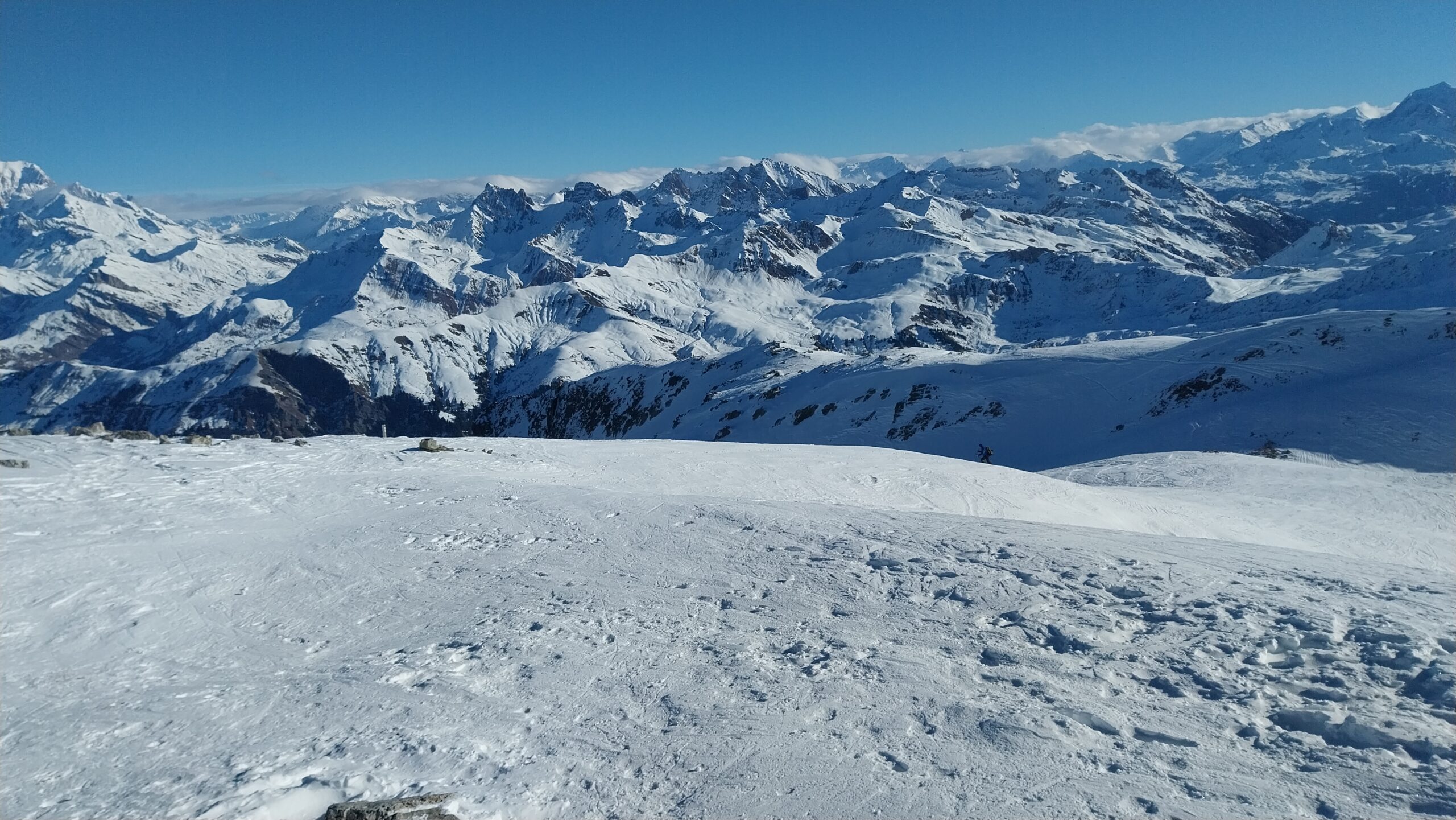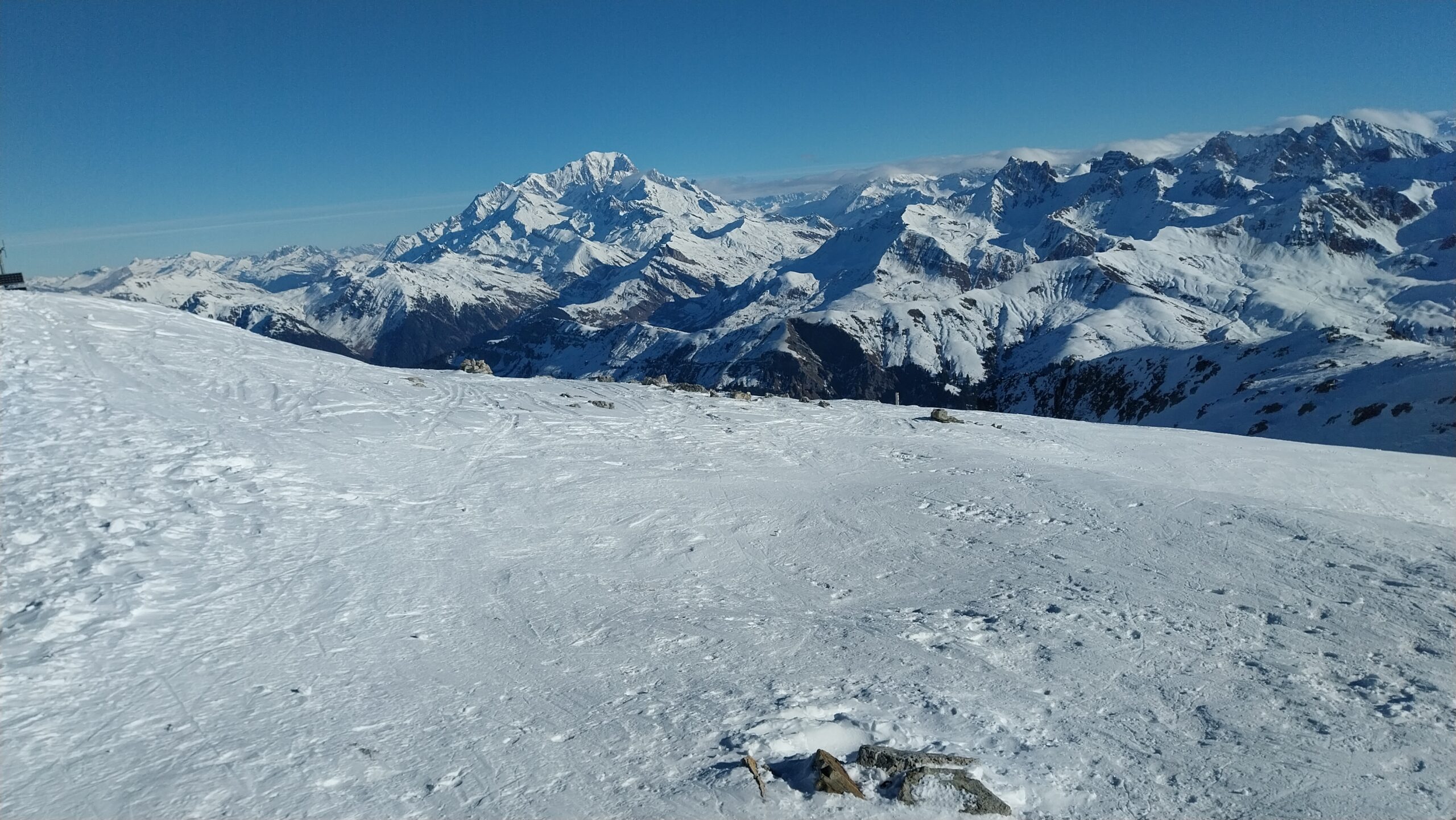Croûtée dans les Combettes, alternance de grains fin/neige dure jusqu'à la brèche de l'antécime du Grand Mont, arête mi sèche/mi neige dure. Neige dure dans le début de la descente.
