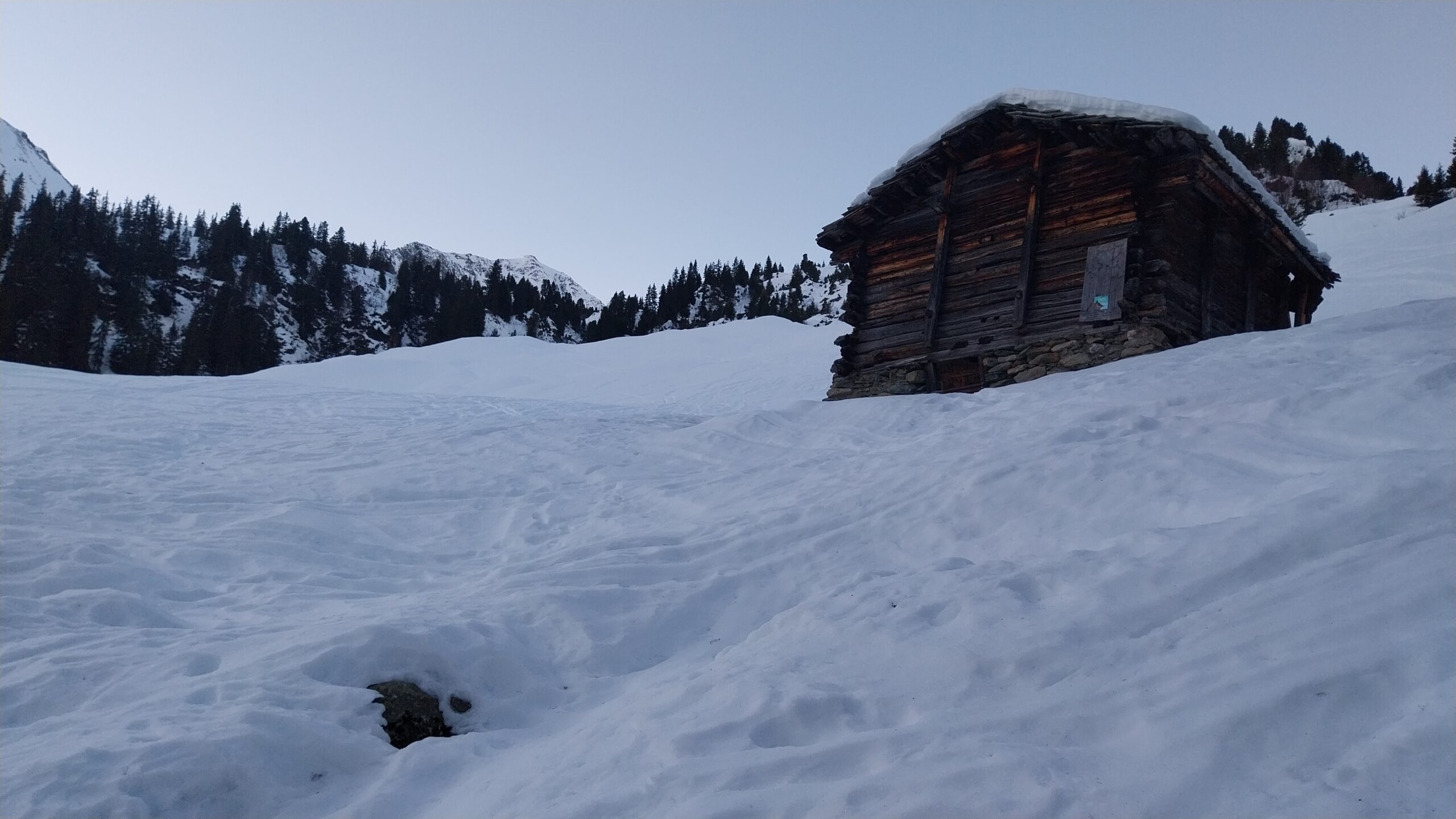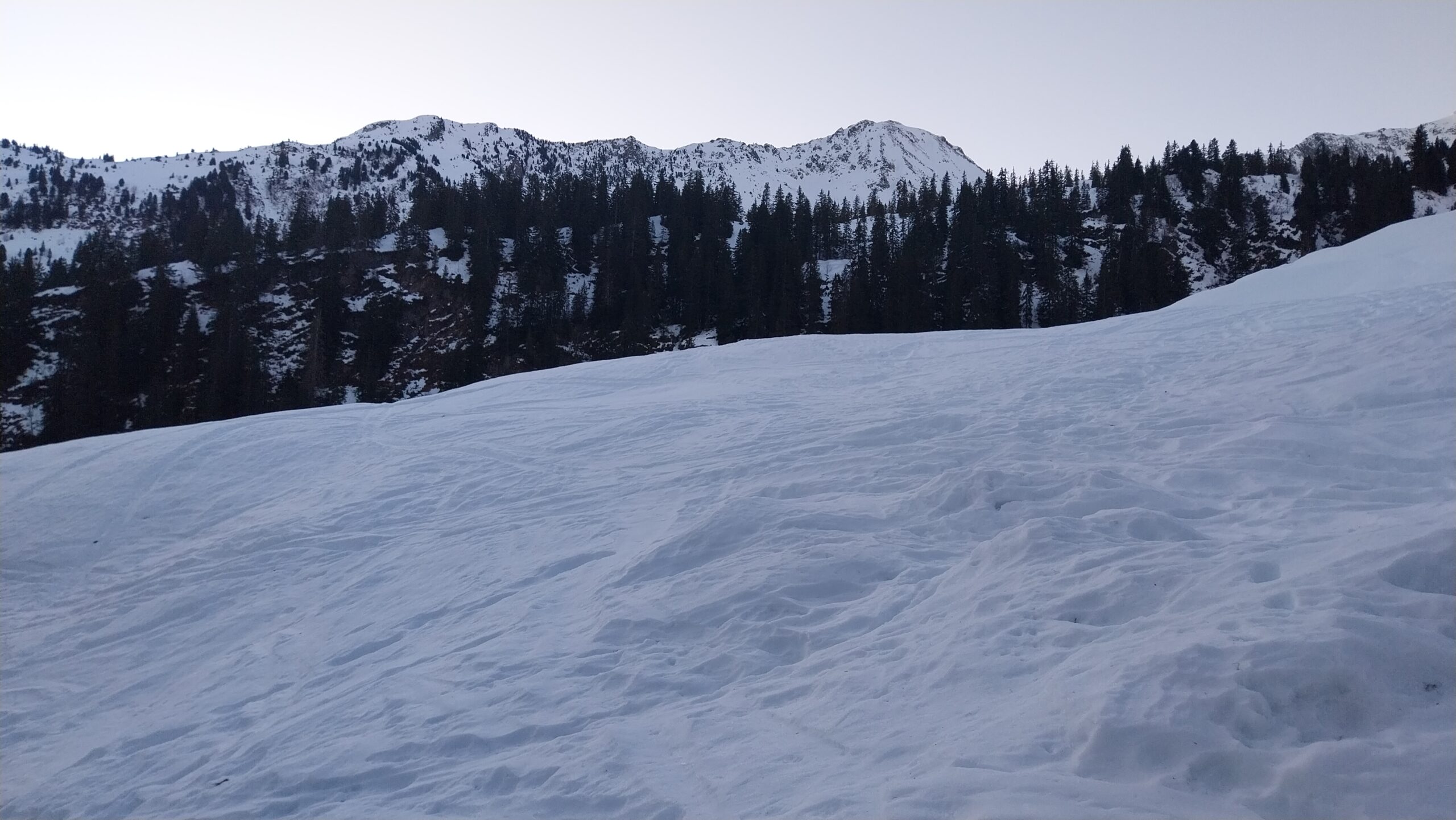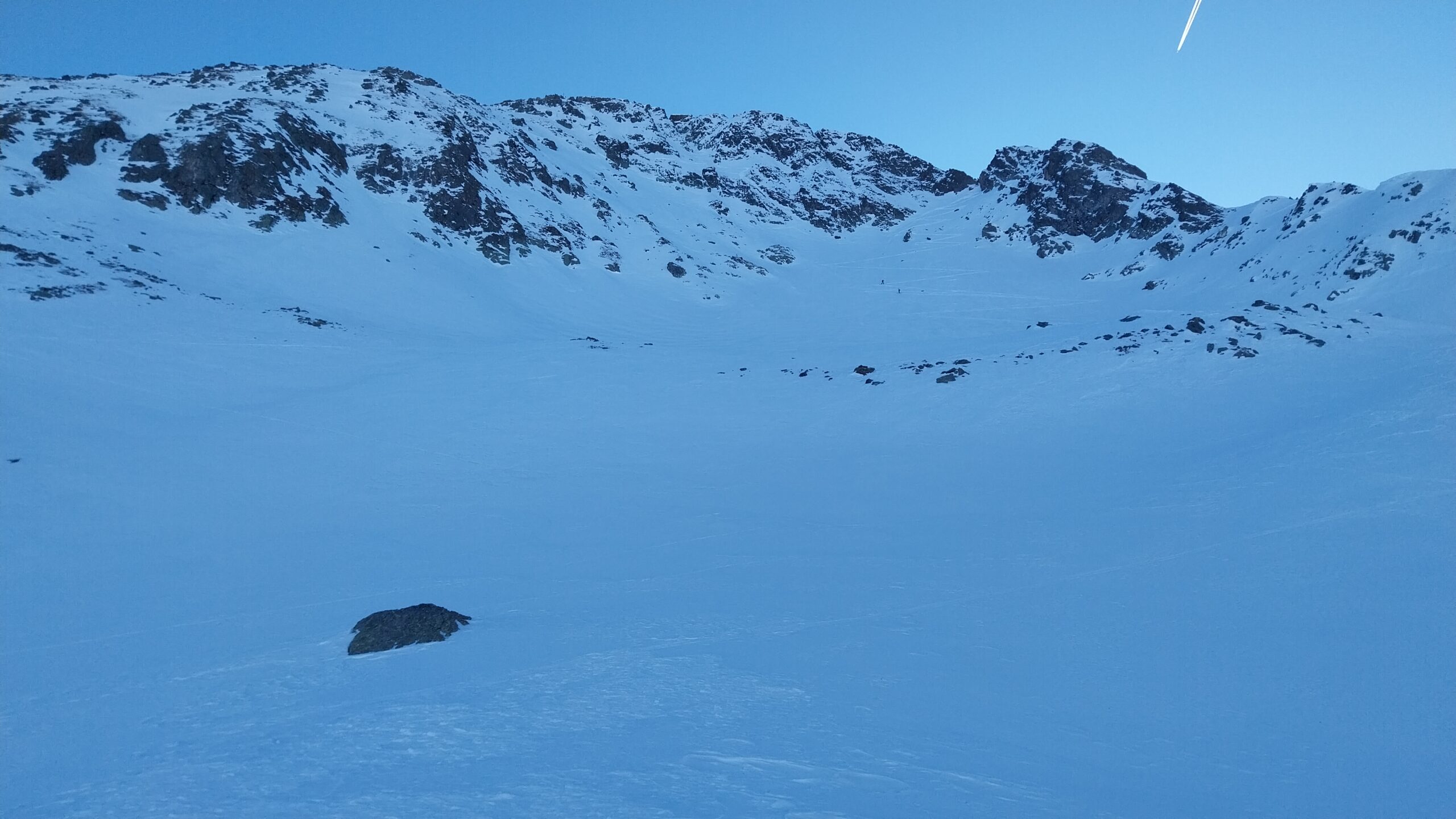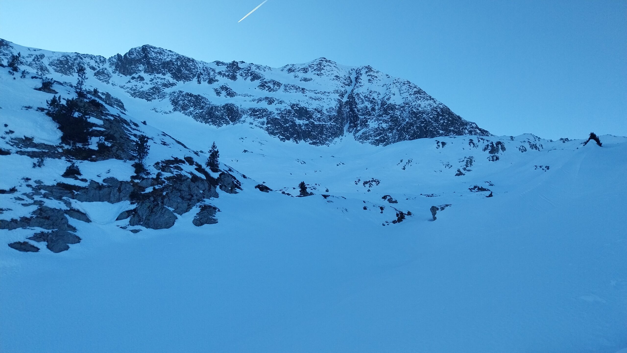 Croûtée dans les Combettes, alternance de grains fin/neige dure jusqu'à la brèche de l'antécime du Grand Mont, arête mi sèche/mi neige dure. Neige dure dans le début de la descente.