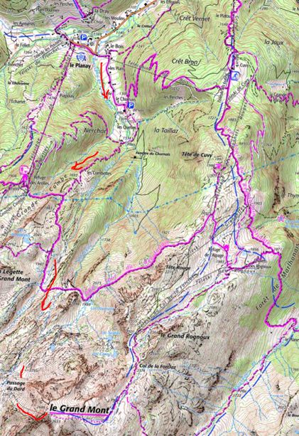 Le Planay, piste de skis jusqu'à Le Chornais, combe Les Quefins, sentier des Combettes, traversée jusqu'au passage du Dard, brèche, puis arête.
