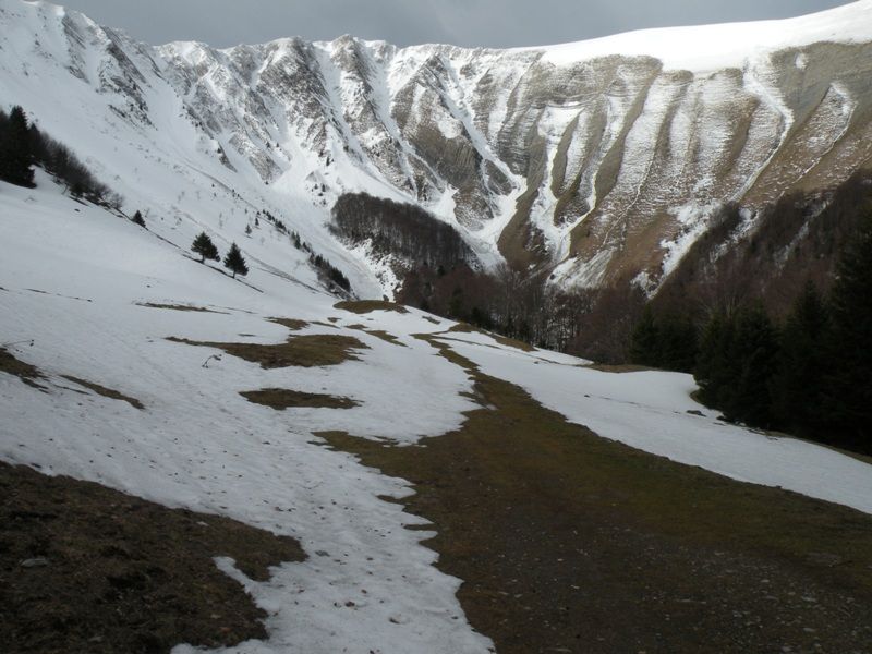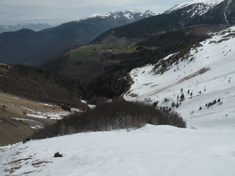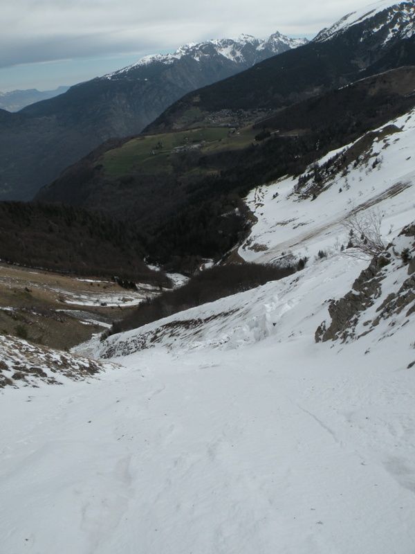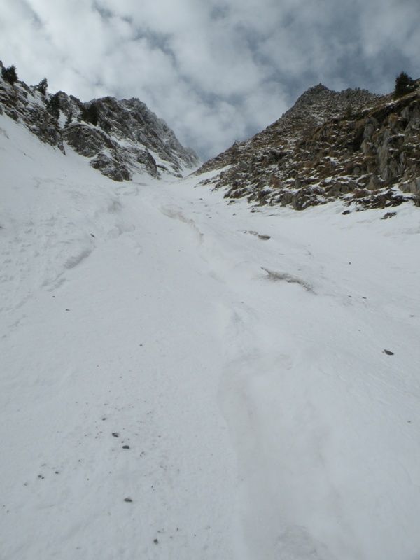 Encore un But... J'ai voulu voir sur place les conditions et être à l'abris du vent. Pour le vent c'était pas mal j'ai pas souffert, par contre les conditions dans le couloir sont pas terrible. Le bas est inskiable à cause des blocs de neige (avalanche) c'est pour cela que j'ai basculer dans l'autre couloir à 1650. Au dessus ça ski pas trop mal de 1650 à 1800 avec quand même une grosse saignée au centre du couloir qui coupe le couloir en deux. Au dessus c'est plus sport avec de la neige sans trop de cohésion et s'alourdissant, une saignée encore plus grande, j'ai fait pas mal de dérapage sur 50m. J'ai fait demi tour car beaucoup de cailloux venaient du haut surement à cause du rechauffement, j'étais pas serein entre la neige oû j'enfonçais de plus en plus est les caillasses. Je suis pas sûr que cela sorte facilement sur le haut d'en bas la corniche à l'air bien présente. Un couloir qu'il vaut surement mieux prendre pas le haut, mais j'aime bien savoir dans quoi je m'engage d'où la remontée.