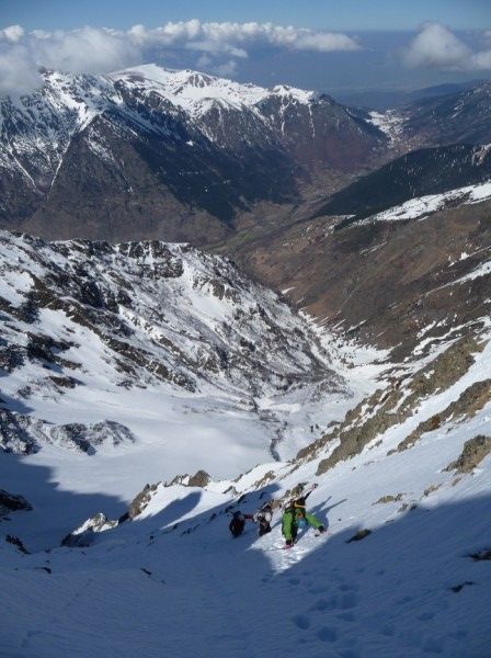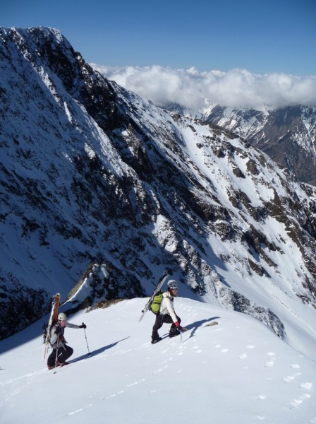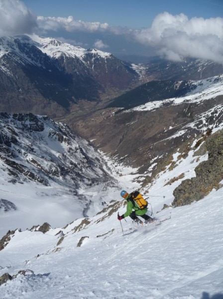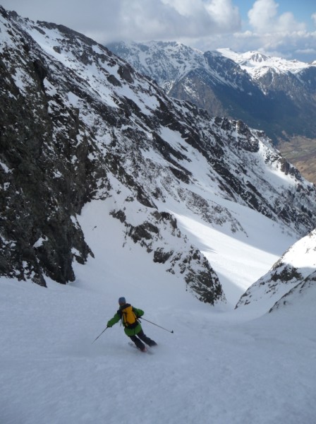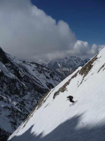 Une impression que ça devrait passer d'en face, puis un repérage + précis du Grand Serre : OK ! Un couloir surprise qui se voit de nulle part ailleurs. Pas trop raide au départ, puis la rampe se raidit et un final bien raide le tout pour 400m de couloir. Le dernier à ouvrir (?) du versant W Grand Vent/Armet, le plus court, mais pas forcément le moins raide, et c'est toujours plaisir de faire une ouverture ici, quand on sait le nombre de passage qu'il y a eu cette année ds ce vallon ! désolé pour ceux qui pensaient avoir tout fait, il va falloir revenir - ou un challenge pour d'autre : enchainer ces 4 somptueux couloirs en une journée, bon courage... cot 5.2/E4. Au global de la journée, 700m de couloir inédit pour 1785m de déniv. D'autres impressions et photos [ici.->http://lesbertonches.over-blog.com/article-29908614.html]