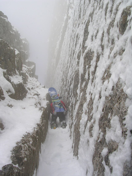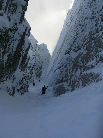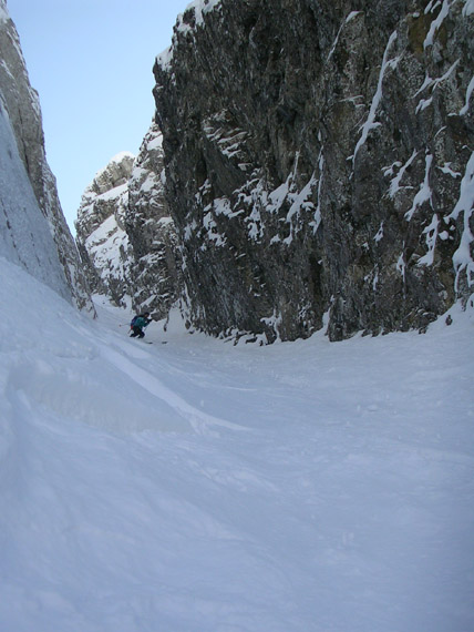 Dans la pente d'accès à la faille, les 20 premiers cm partent en coulée. Grosses accumulations de poudre en rive droite de la partie haute de la faille. Les goulottes d'accès à la partie basse de l'itinéraire sont en neige dure. La partie basse de la faille est d'abord en poudre sur fond dur sur 150m, puis la partie très étroite (2m50) est très mal enneigée et en neige dure avec une nervure rocheuse en son milieu (inskiable, crampons sur 100m).