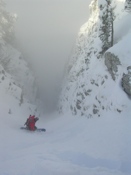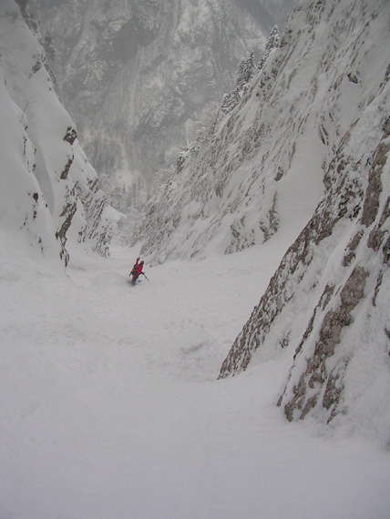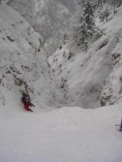 Quelle ambiance, cet itinéraire est somptueux !! Encaissé et soutenu sur près de 1000m !! Le seul bémol du jour est le passage très étroit de la partie basse, non skié pour cause de mauvais enneigement sur 100m (Ca nous apprendra à le tenter à vue!!). La bétise du jour est pour moi quand je m'aperçois sur le parking que j'ai oublié mes raquettes, du coup montée un peu plus longue que prévue? Un grand merci à Eric pour le repérage de la partie basse fait auparavant. Voir aussi le compte rendu de Jean-Luc sur c2c