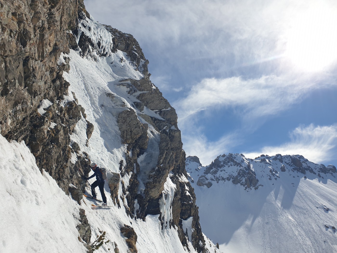 Montée et descente n°4 : face O, répétition de la ligne de Paul Bonhomme avec un déchaussage de 2m vers le haut et une désescalade de 30m en crampons en bas.