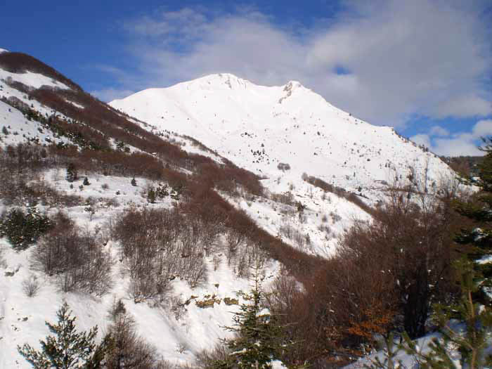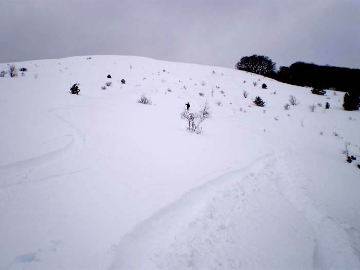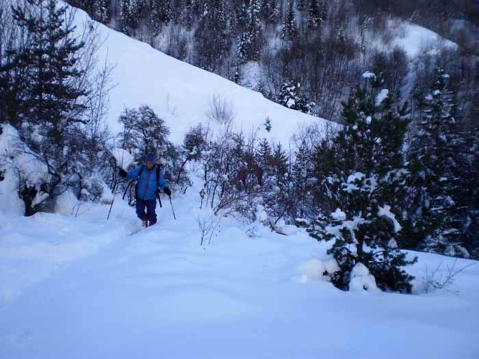 Partis pour effectuer le circuit du Puy en passant par Melette, le brassage conséquent dans une belle couche de poudreuse (2h pour parvenir à 1400 dans la combe entre Melette et le Puy en débutant RD puis RG du torrent de la Rivière) nous a conduits à modérer nos ardeurs : montés directement au col entre Melette et le Puy, nous avons remonté la croupe nord du Puy. Descente ensuite de la croupe puis basculement dans le versant est en suivant l'orée du bois. Puis plein est dans les belles pentes jusqu'à rejoindre vers 1350 le sentier d'été balisé en rouge.