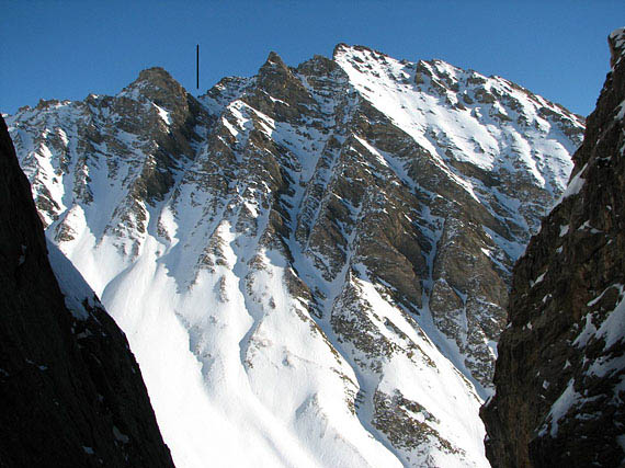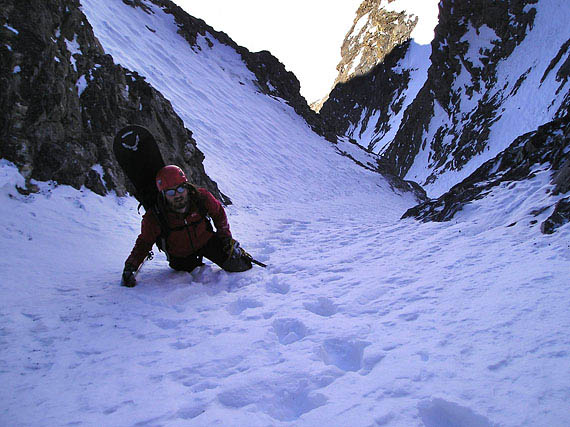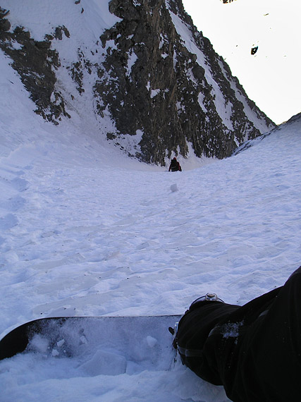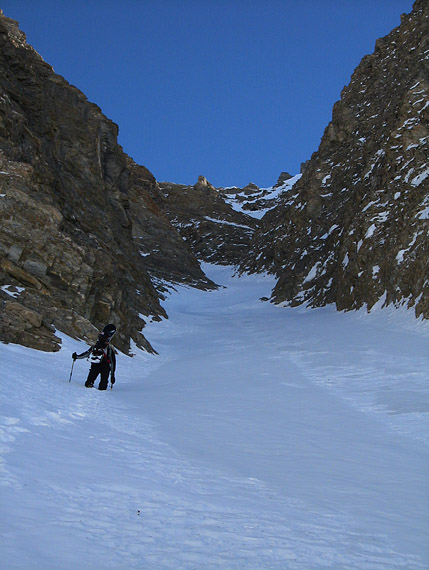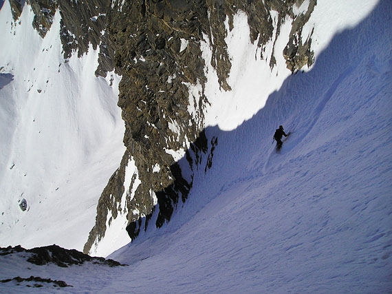 Au bout de 250m, il fait une courte chicane en rive droite (bien expo à partir de là), s?en suit une petite centaine de mètres plus étroite et plus raide (>45°) avec un ressaut (pass. 50°) en neige dure.