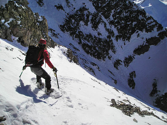 La pente se calme et vient la traversée peu enneigée et expo vers la gauche pour sortir au niveau d?un petit col. Il est peut être possible de passer tout droit par bon enneigement avec une sortie plus raide sur 30 m(>50°).