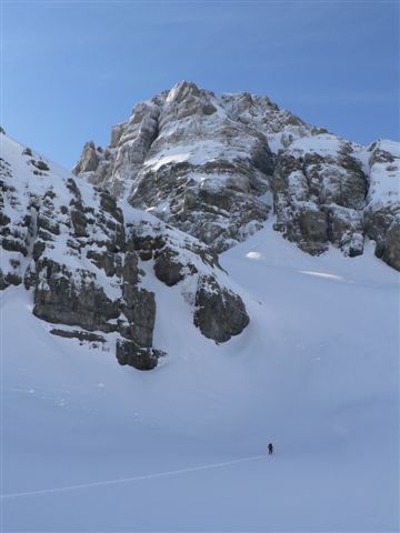 Van d'en Haut>col de Susanfe>descendre 100m>par une faiblesse dans des barres, remonter>SE. Le couloir fait 350m