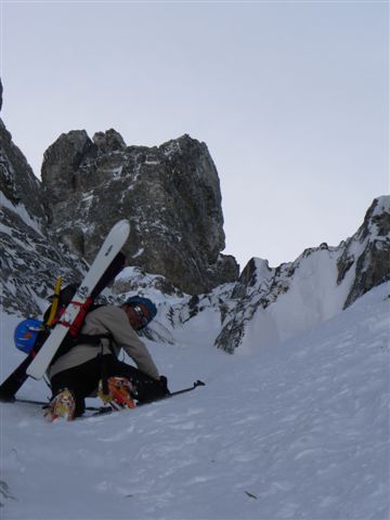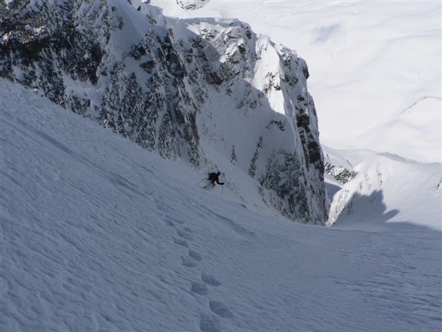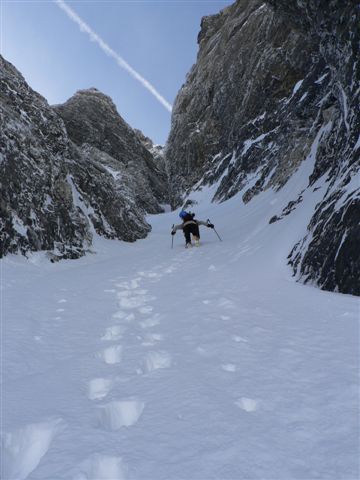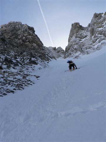 2° couloir skiable de l'Eglise, 150m à 45°-50°, puis il fait un coude vers la gauche (45°-50°) sur 100m. 1ère étroiture entre des rochers, non skiable, puis 50m à 50-55°, 2ème étroiture, non skiable, enfin 50m à 45-50°. Le couloir sort sur une épaule 50m sous le sommet. Beau couloir, mais l'approche est bien longue pour seulement 350m de couloir. D/5.2/E3 à confirmer.