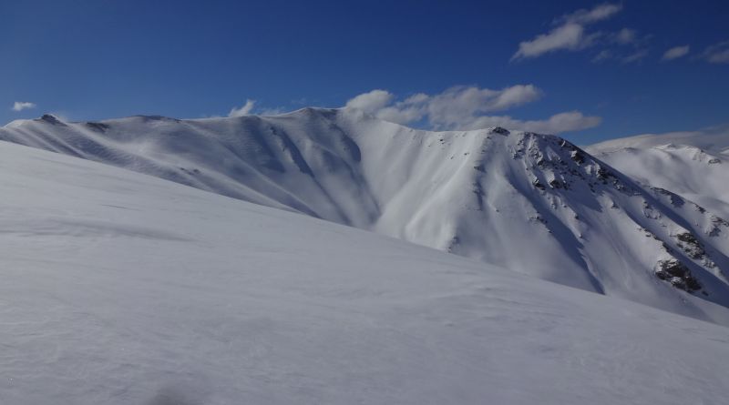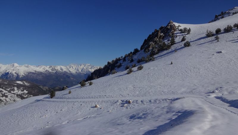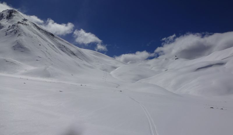 Longue balade en peaux depuis 2030 m ou l'auto n'arrive plus à passer (dans deux jours on pourra aller au terminus). Tricotage sur I9 nord sud descente sur le Chagnon et remontée crête rive droite ravin des Couniets.