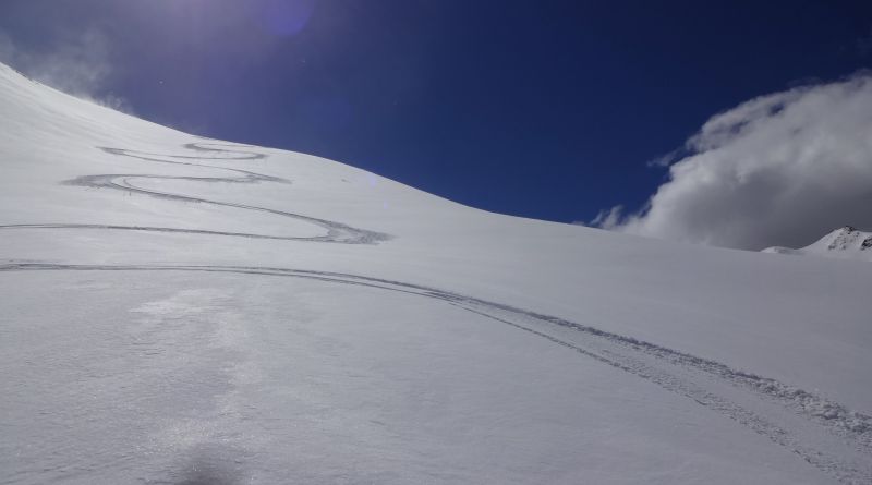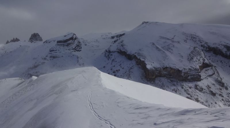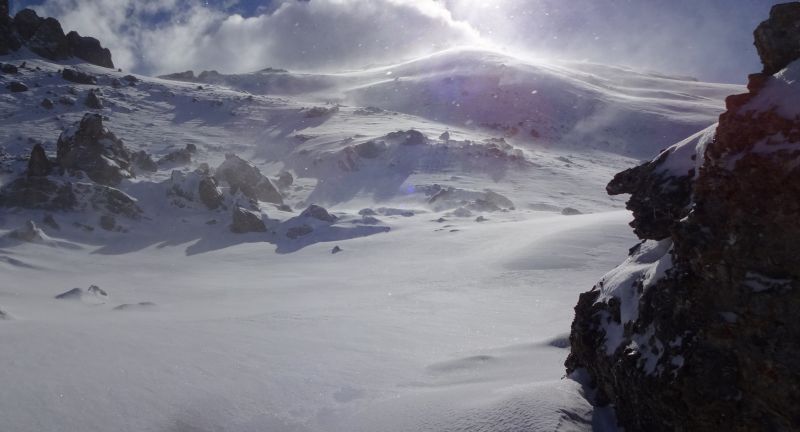 Il a moins neigé que dans le Queyras plus à l'est mais dés 2000m la couche de poudre dense était de 20cm. Aspect hivernal mais dessous le sol n'est plus gelé. La vieille neige elle même est restée humide ou avec une croûte non portante sous la fraîche pas plus épaisse qu'en bas.Au dessus le vent a tout remanié, avec des arêtes décapées et des accumulations fragiles comme sur I9.1 ou une grande plaque s'appuie sur le grand entonnoir jaune saharien du sommet. Suspect !