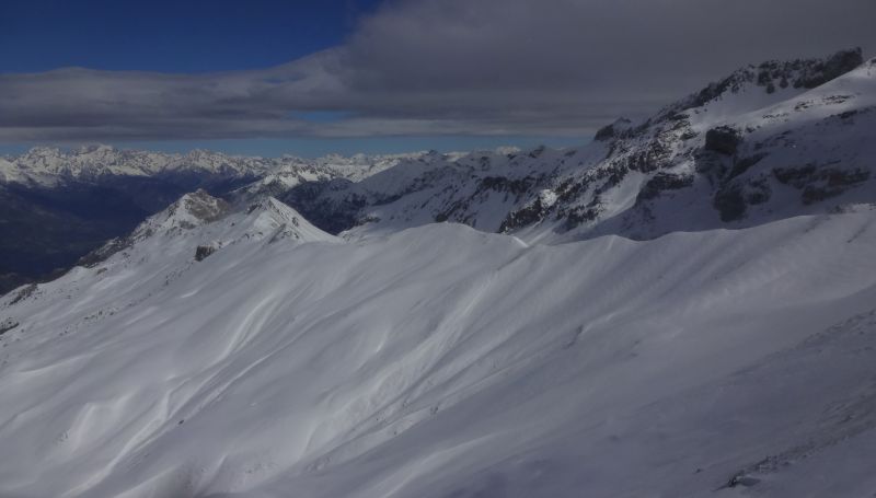 Objectif initial dans le Val d'Escreins mais une fois encore la route est obstruée dés la nationale. Décidément on évolue peu sur ce sujet à Vars même s'il n'y a pas de neige. Reconversion vers la Mortice, car la barrière est levée à St Catherine...mais dés 2000m ça ne passe plus. Arrivé sur les crêtes, les nuages d'est débordent, le vent est éprouvant et les pentes pas en conditions attrayantes. Le sommet 2821 fera mon affaire. Ambiance esthétique. Mais pas du grand ski avec une sous couche piégeuse et parfois les pierres sous la poudre.