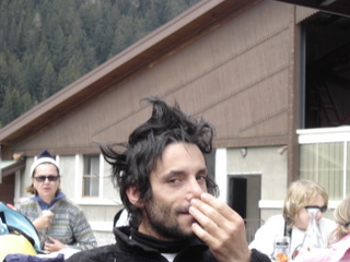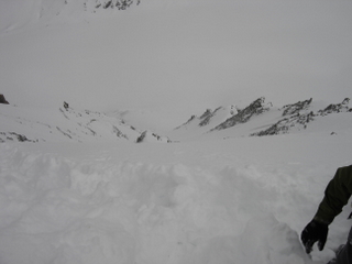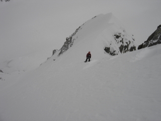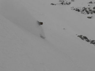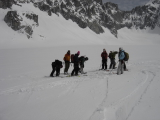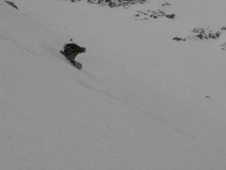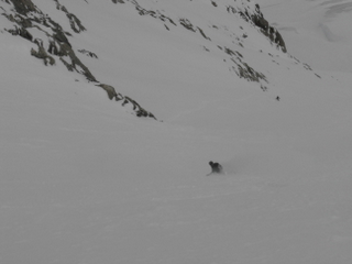 on pensait passer en versant sud, grosse croute car le soleil était voilé, du coup nord est de rêve avec une belle équipe motivée, super poudre, qq chose comme 4 ou 5 mn de descente. un grand merci aux 2 premiers traceurs qui ont tracé la première moitié de la pente.