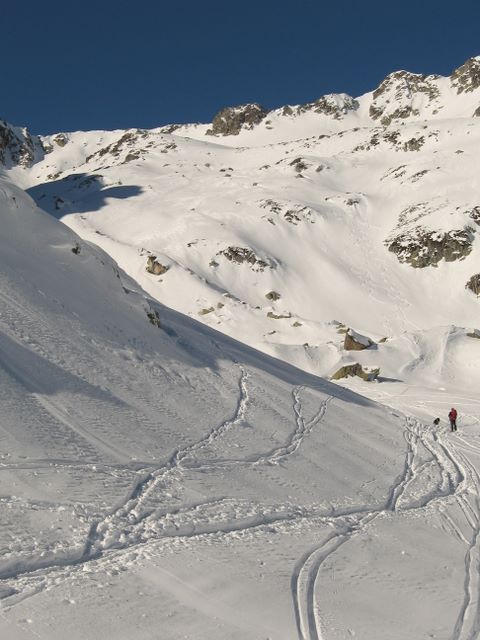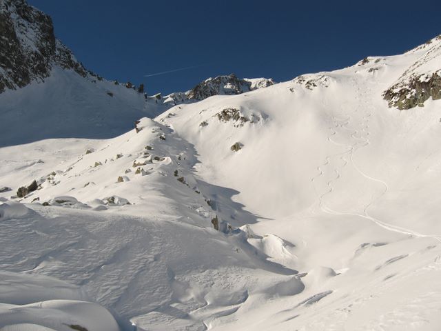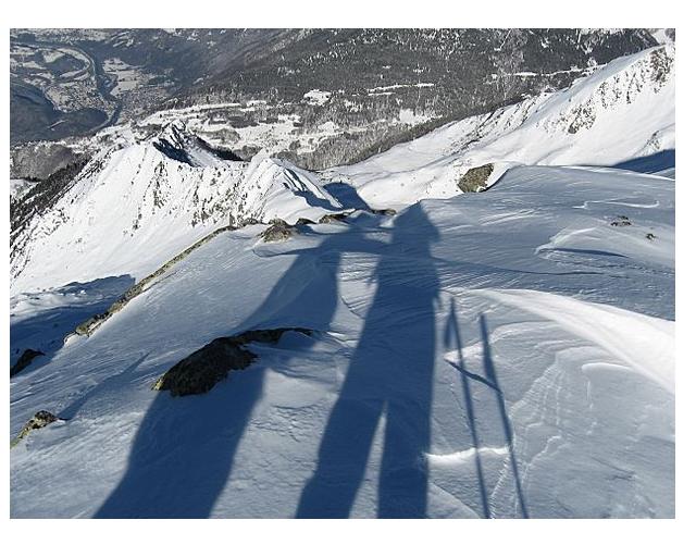 Secteur moins arrosé que Beledonne, surtout sur le bas. Sinon ça passe encore pas mal au départ des Celliers, en récupérant qlqs lacets de la route de l'Arpettaz. Poudre idéale durant toute la descente entre 11h30 et 12h30. Quelques petites coulées sur les crètes ... ca chauffe rapido.
