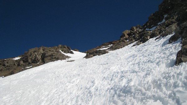Descente vers 13H30 de la Face Ouest dans une neige non revenue (vent dans la face) mais le grip est bon.
