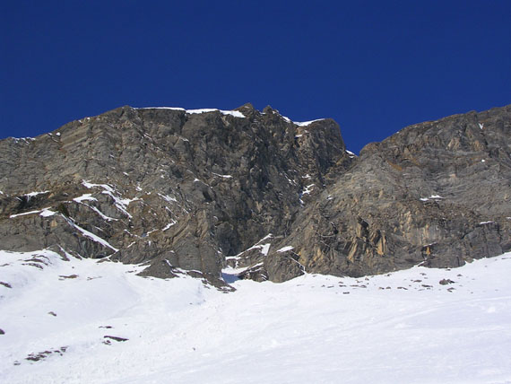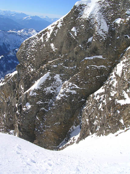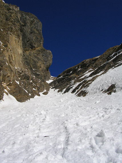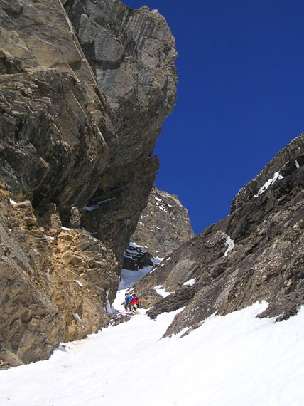 Le couloir était bon mais limite descendre en ce moment avec pas mal de pierres enchâssées dans la soupe, une étroiture (1m50) qui a forcé les skieurs à un court déchaussage.