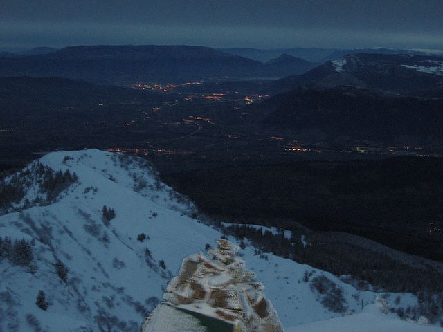 Départ 16h30, c'est la fermeture des quelques pistes ouvertes. Du coup on a passé un superbe moment, avec la tombée de la nuit et une vallée illuminée par l'éclairage des villes. Et pour ne rien gacher, soyons sport, du très bon ski tout en touché, sur cette moquette dammée. Y-a-plus-qu'à attendre la grosse couche annoncée !!