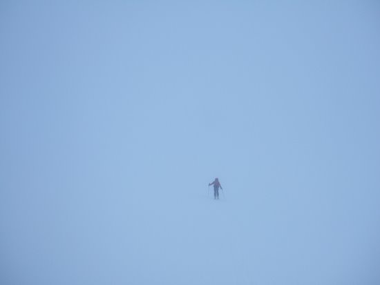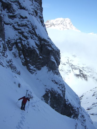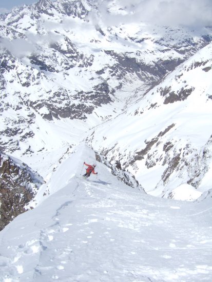 Le glacier en S était recouvert de 10cm de poudre légère tombée dans la nuit qui ne s'agrippait pas à la sous-couche gelée. Seuls les 300m du haut furent agréables a skier avec 30cm de poudre adhérant bien à cette couche gelée.