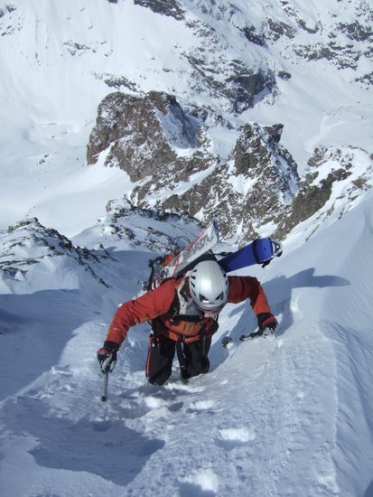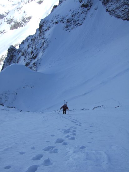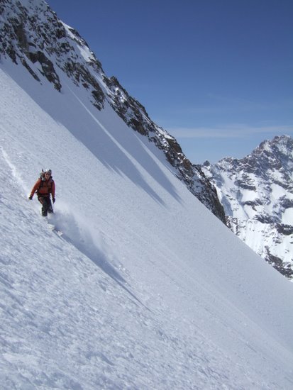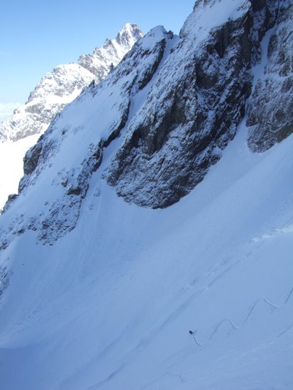Cependant le Glacier en S est vraiment beau, dommage que nous n'ayons pas eu de la poudre sur les 800m du couloir et pu skié du sommet, le 55° en neige gelée c'est pas top!