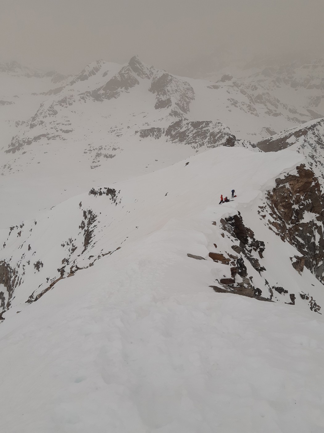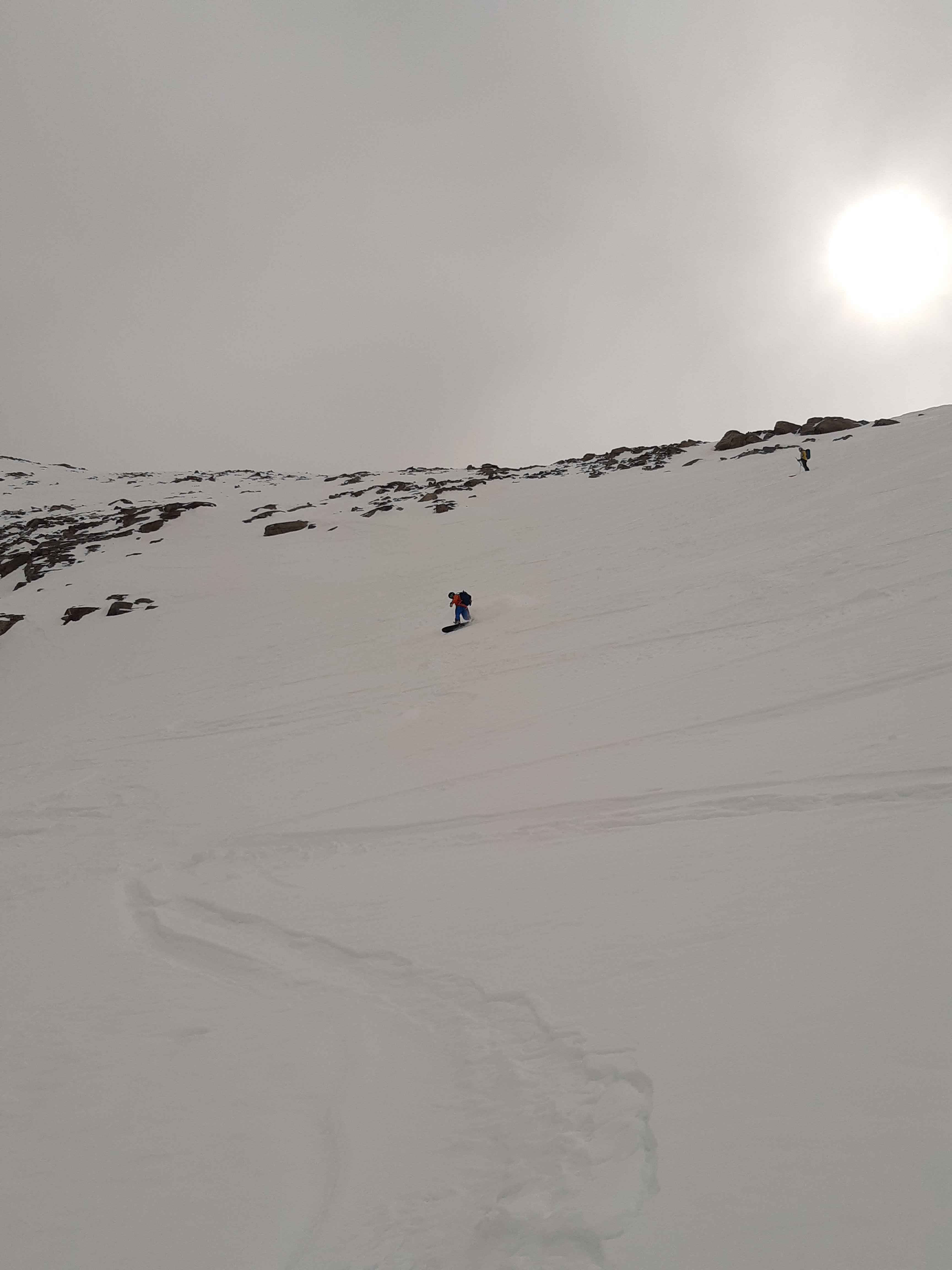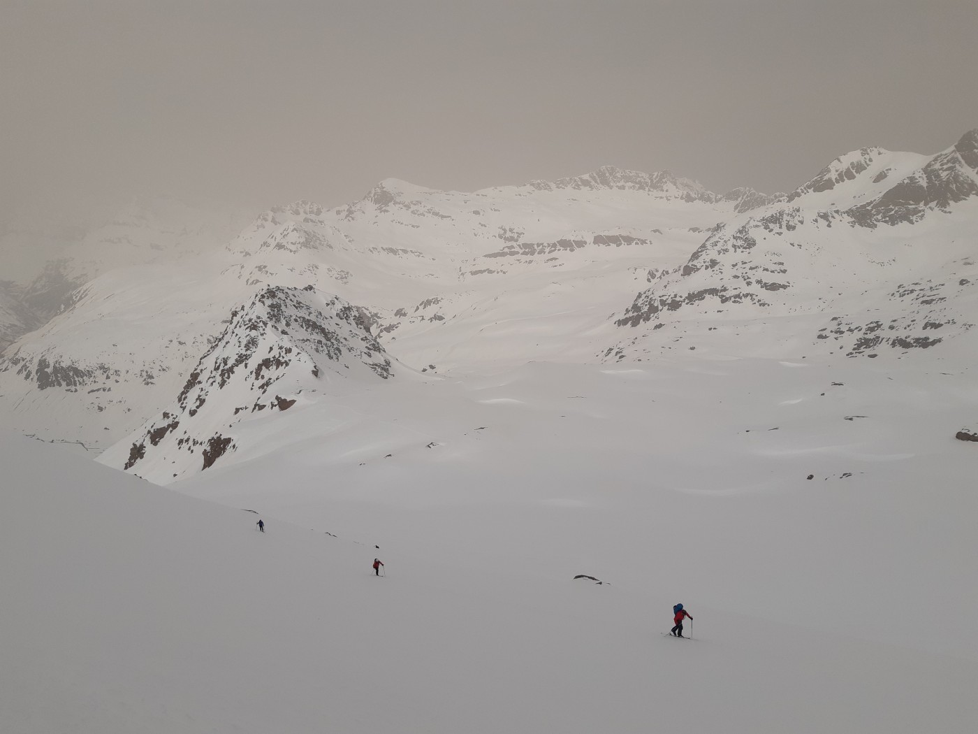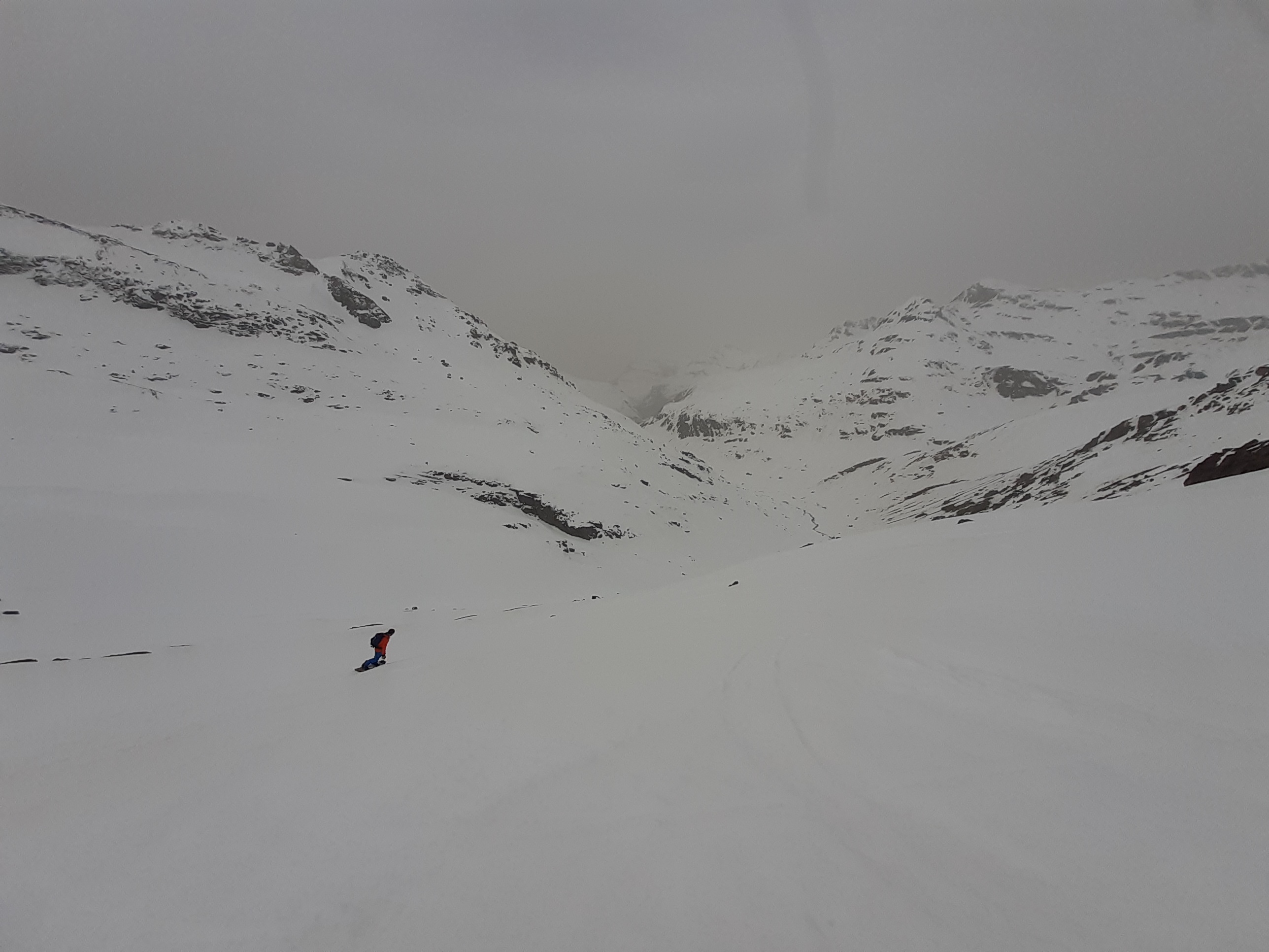 Un bon moment en montagne avec un refuge presque complet (mais excellente bière !) et un enneigement excellent suite aux retours d'est à répétition ce printemps. Par contre les "quelques cirrus" annoncés pour dimanche se sont avérés une brume sableuse épaisse avec des éclaircies sporadiques, la grande douceur ambiante permettant toutefois un dégel avec du bon ski à la clé. Bonne galère pour Guillaume en split-board sur les long plats pour rentrer à l'Ecot...