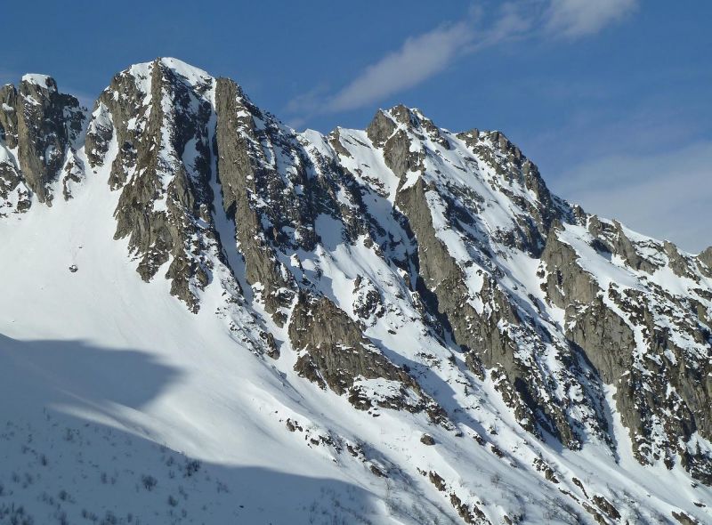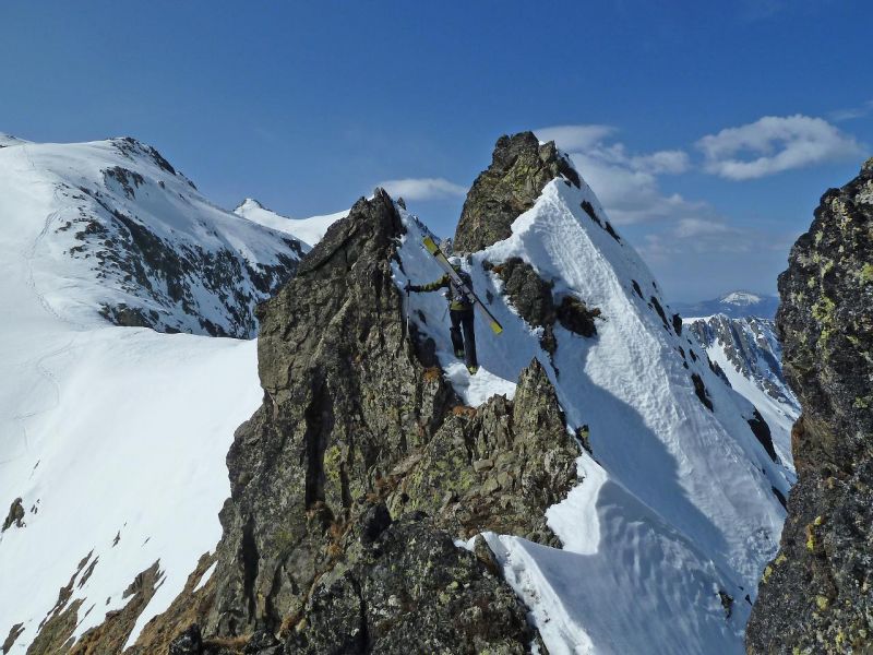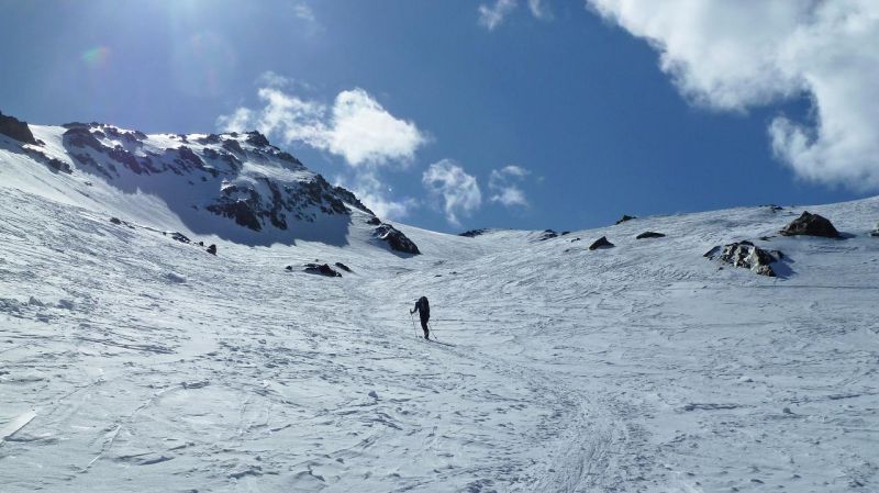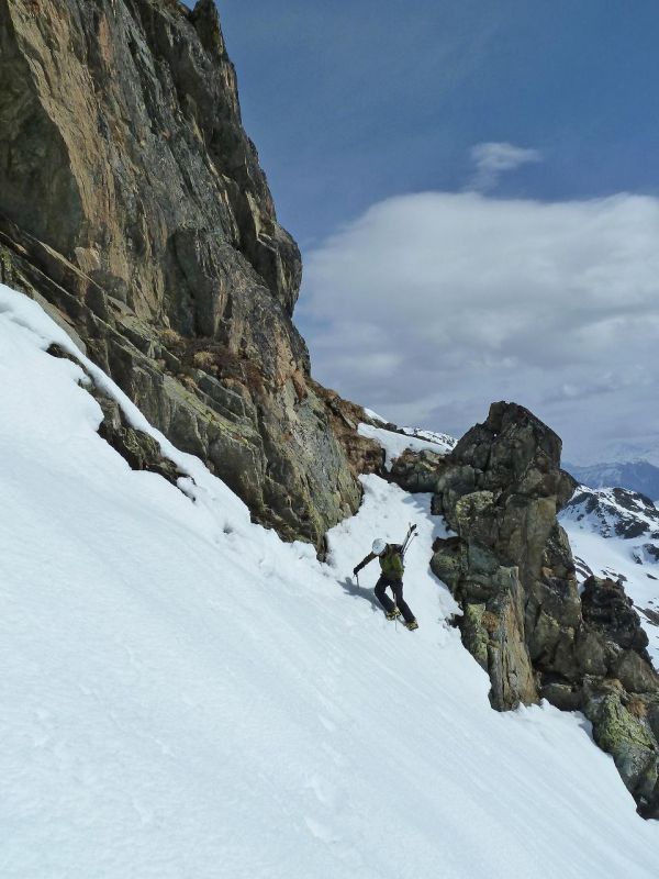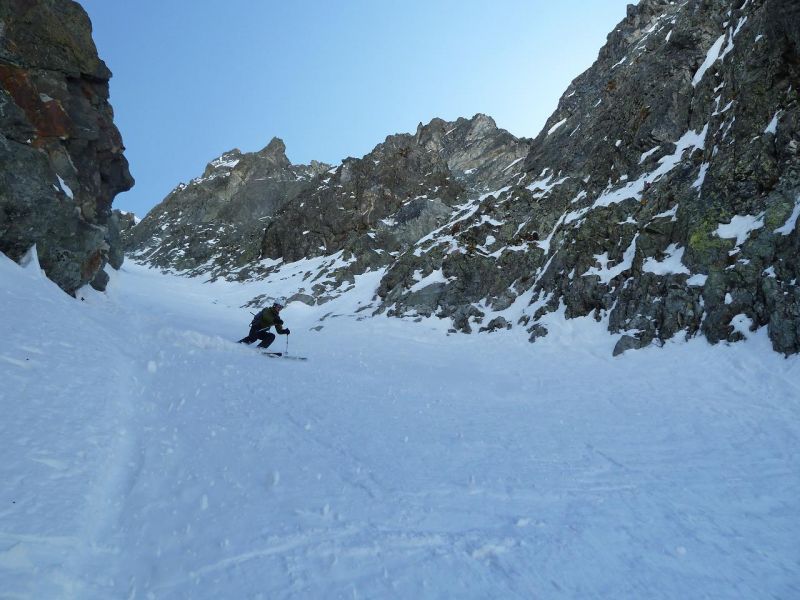 Excepté en début de matinée, c'est finalement le soleil qui s'impose franchement. On en profite pour se balader sur l'arête de la Marmottane, dont le couloir nord-ouest ne restera pas dans les annales : trop abimé en haut par les escaliers, et la neige est en partie regelée (le couloir voit le soleil en fin d'après-midi), même si le bas est plus acceptable.