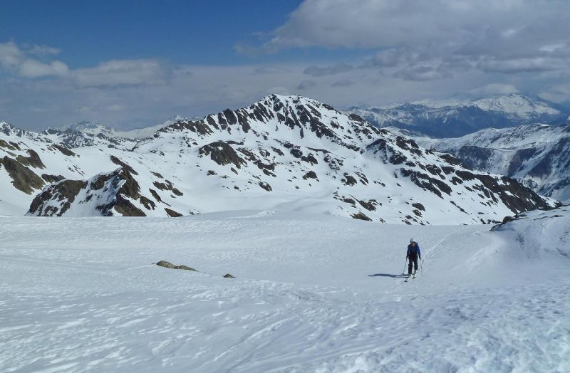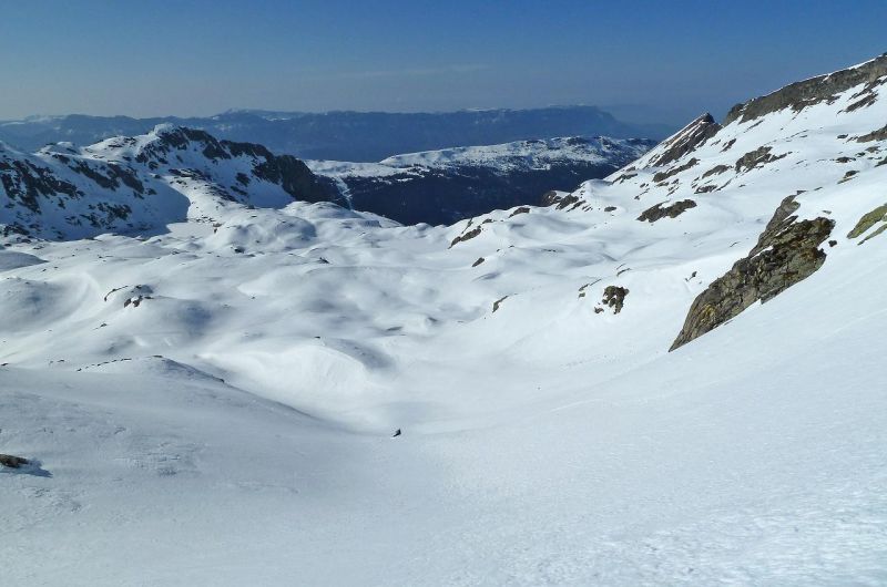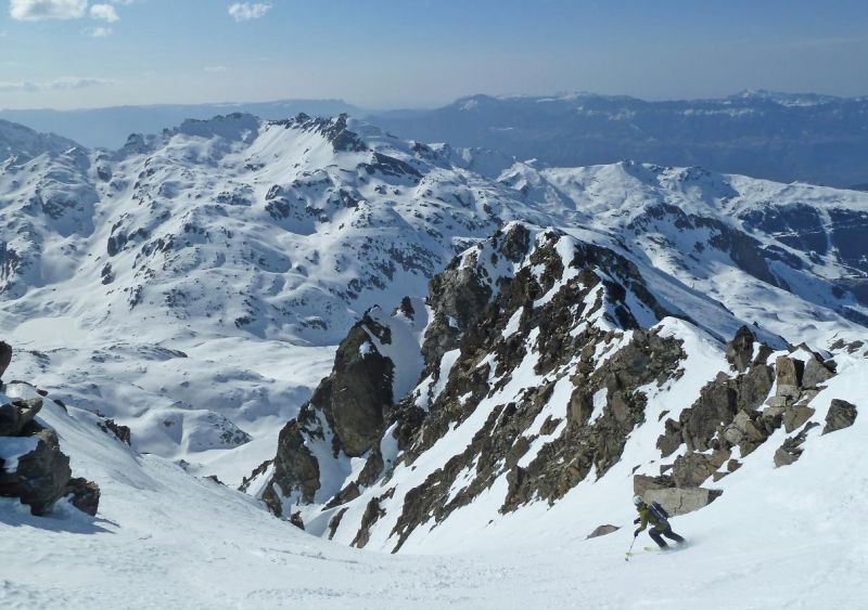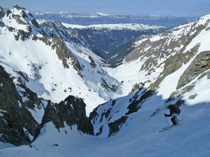 Enfin, bon ski dans le couloir sud-ouest puis dans la longue descente panoramique devant les lacs des sept Laux.